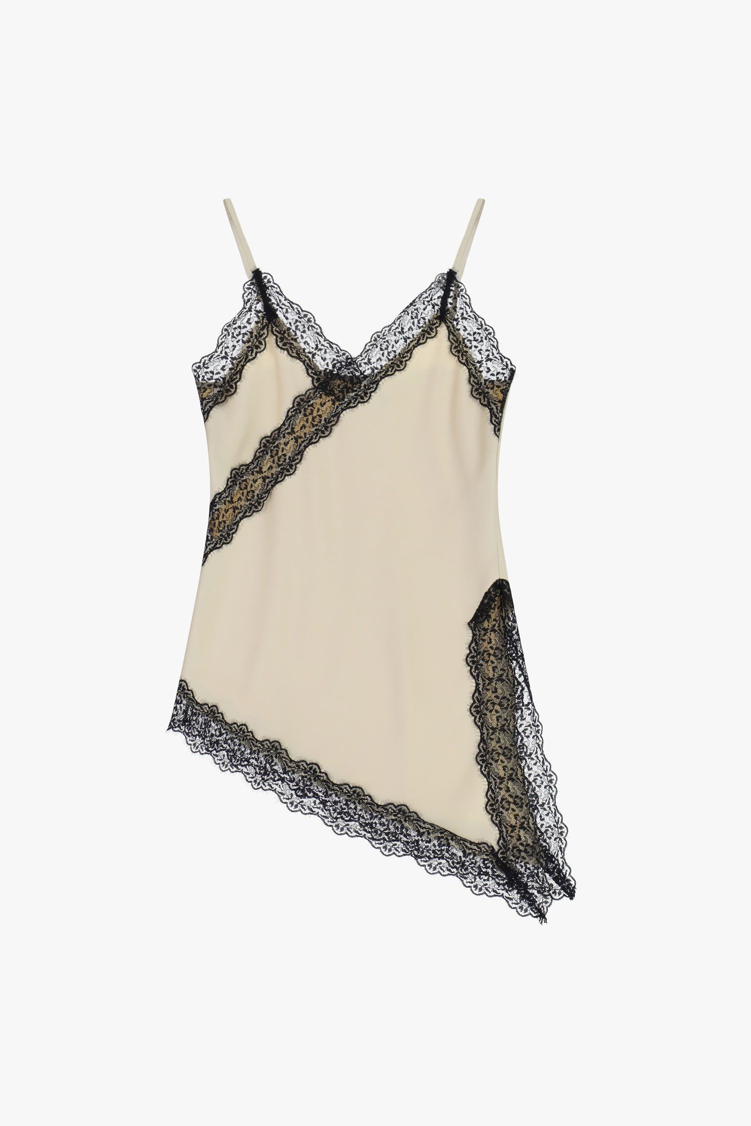 Top o asymetrycznym kroju, zdobiony koronkowymi wykończeniami przy dekolcie i dole. Regulowane cienkie ramiączka podkreślają jego płynną sylwetkę, czyniąc go idealnym dla osób poszukujących wyrazistego stylu wśród współczesnych propozycji. Wszechstronny wybór, który podkreśla indywidualność zarówno na dzień, jak i na wieczór.