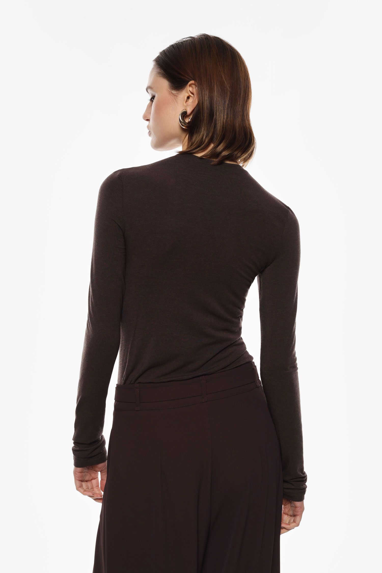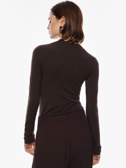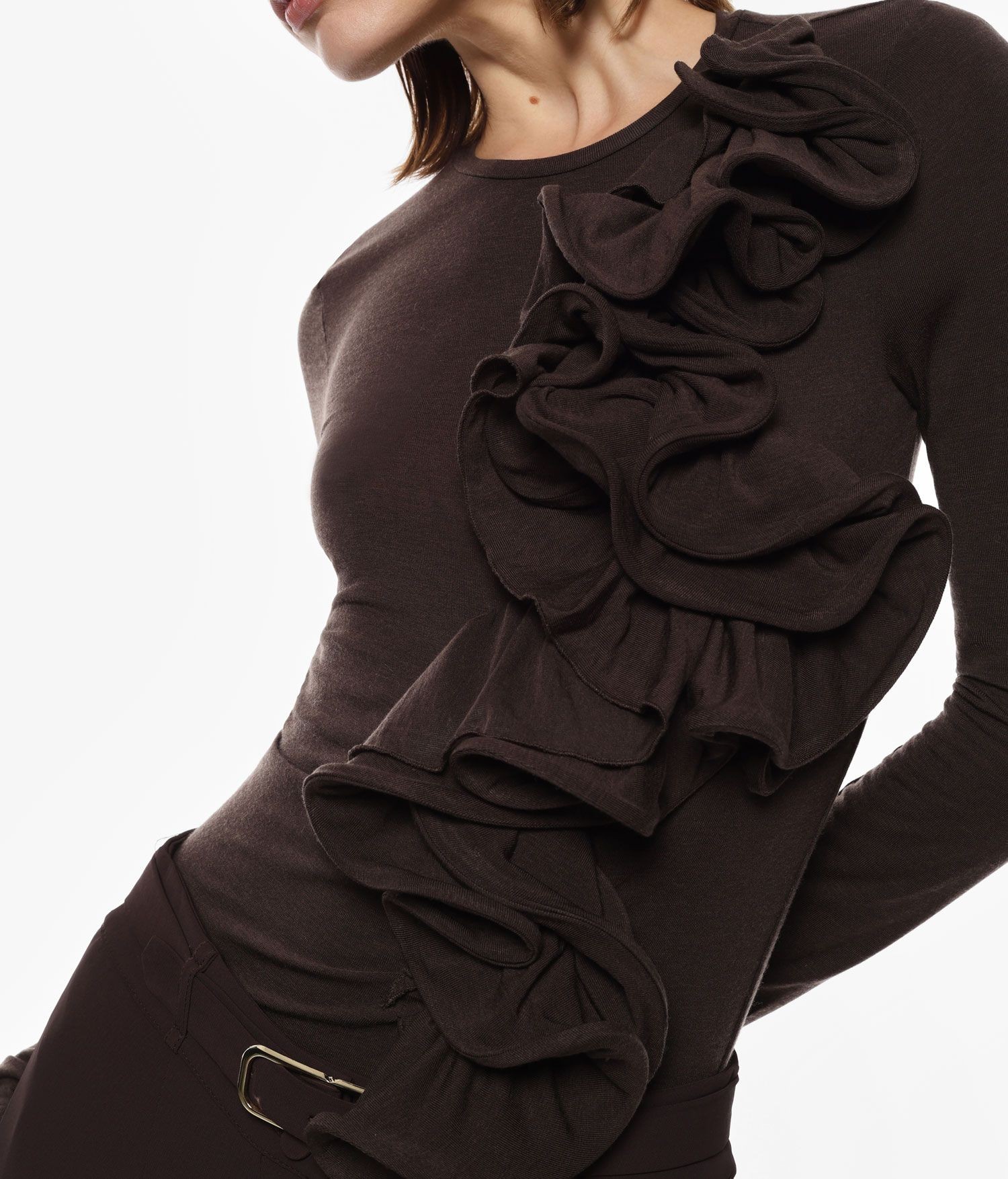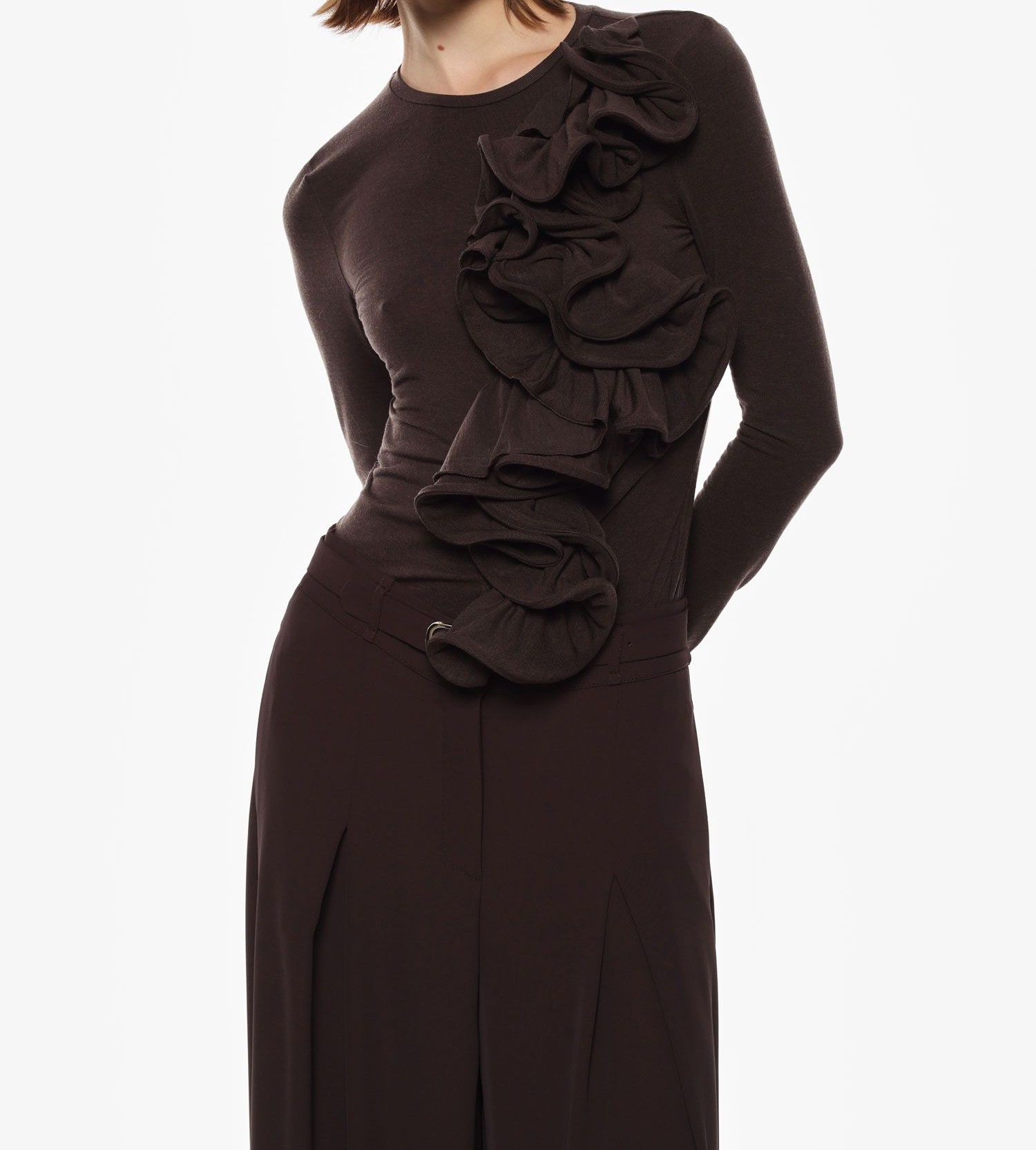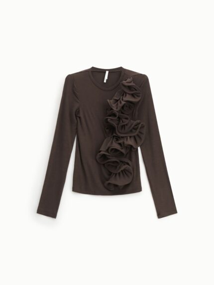 Bluzka z długim rękawem o dopasowanym kroju, wyróżniająca się wyraźnymi asymetrycznymi falbanami z przodu, które nadają jej rzeźbiarskiego wymiaru. Subtelna konstrukcja pozwala na wyrafinowane zestawienia, oferując twórcze możliwości wyrażania siebie w codziennych stylizacjach.