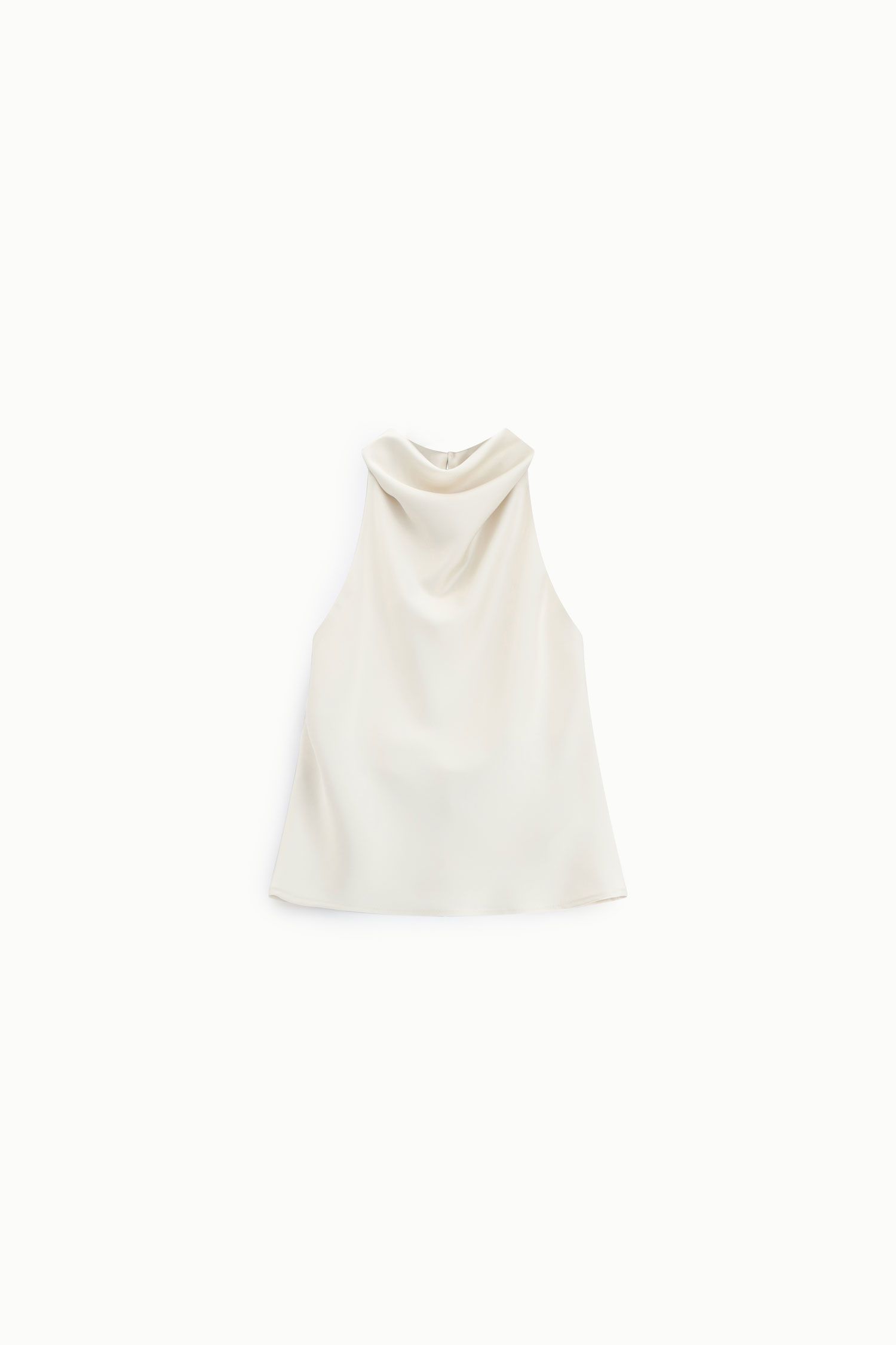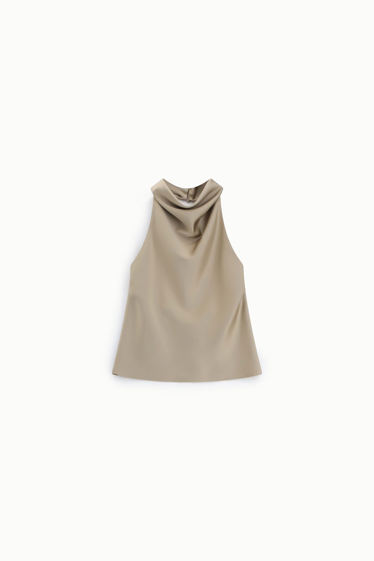 Top  z dekoltem halter i delikatnie drapowanym przodem oraz subtelnym zapięciem z tyłu, stworzony dla osób poszukujących wszechstronności w swojej garderobie. Idealny do tworzenia oryginalnych stylizacji, doskonale komponuje się zarówno z dopasowanymi elementami, jak i casualowymi częściami, umożliwiając nowoczesne i kreatywne interpretacje.