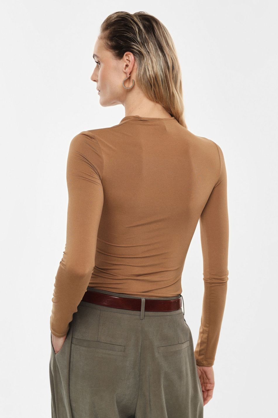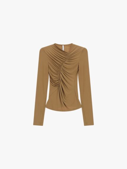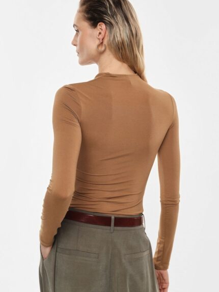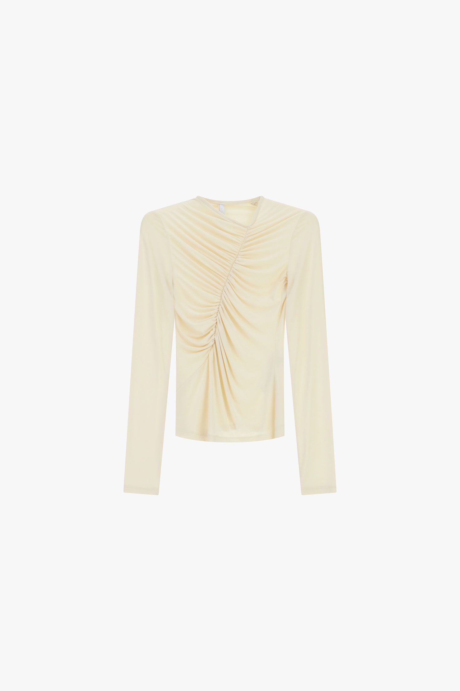 Bluzka z długim rękawem, charakteryzująca się charakterystycznym, skośnym drapowaniem, które podkreśla sylwetkę i oferuje wyrafinowaną grę linii. Asymetryczny dekolt dodaje nowoczesnego akcentu, dzięki czemu ten model jest idealnym wyborem dla osób poszukujących oryginalnych detali i uniwersalnych rozwiązań do miejskiego życia.