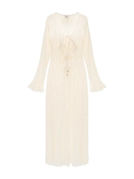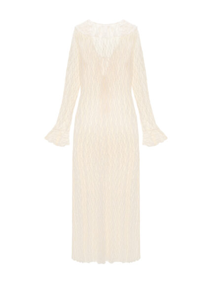 Okrągły, dekolt wykończony plisą z tego samego materiału.