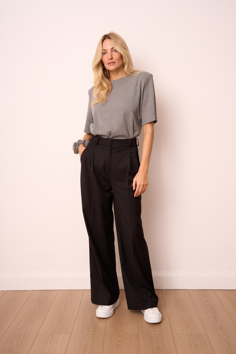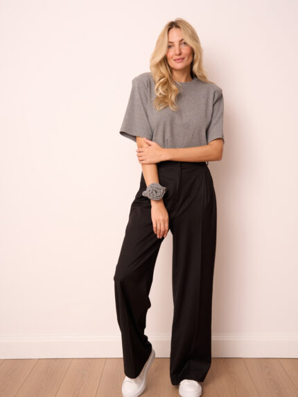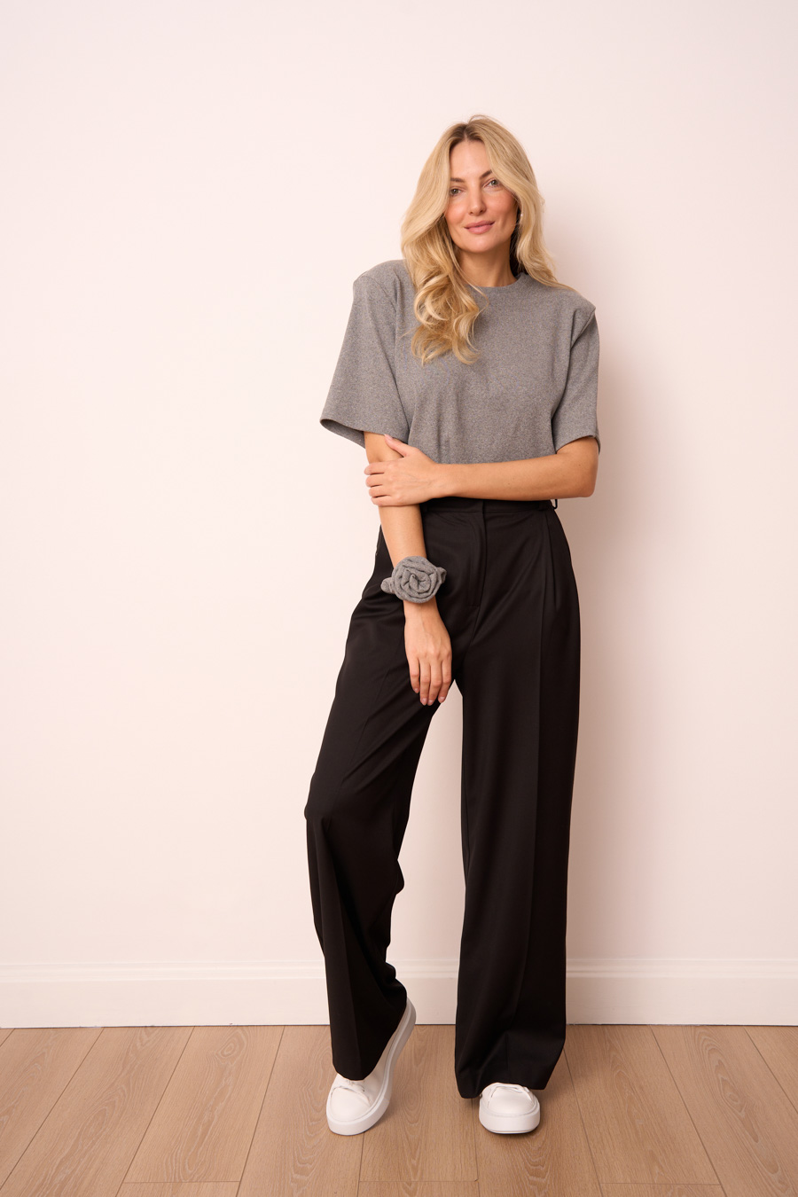 Krótkie, szerokie rękawy. Przerysowana linia ramion z odpinanymi poduszkami.