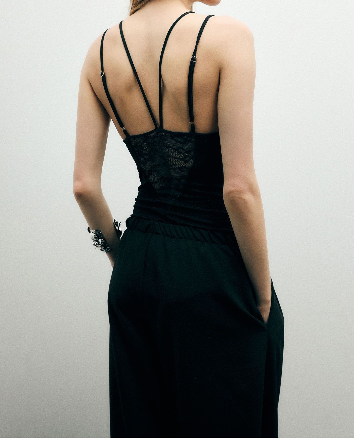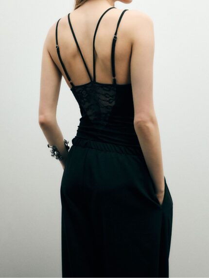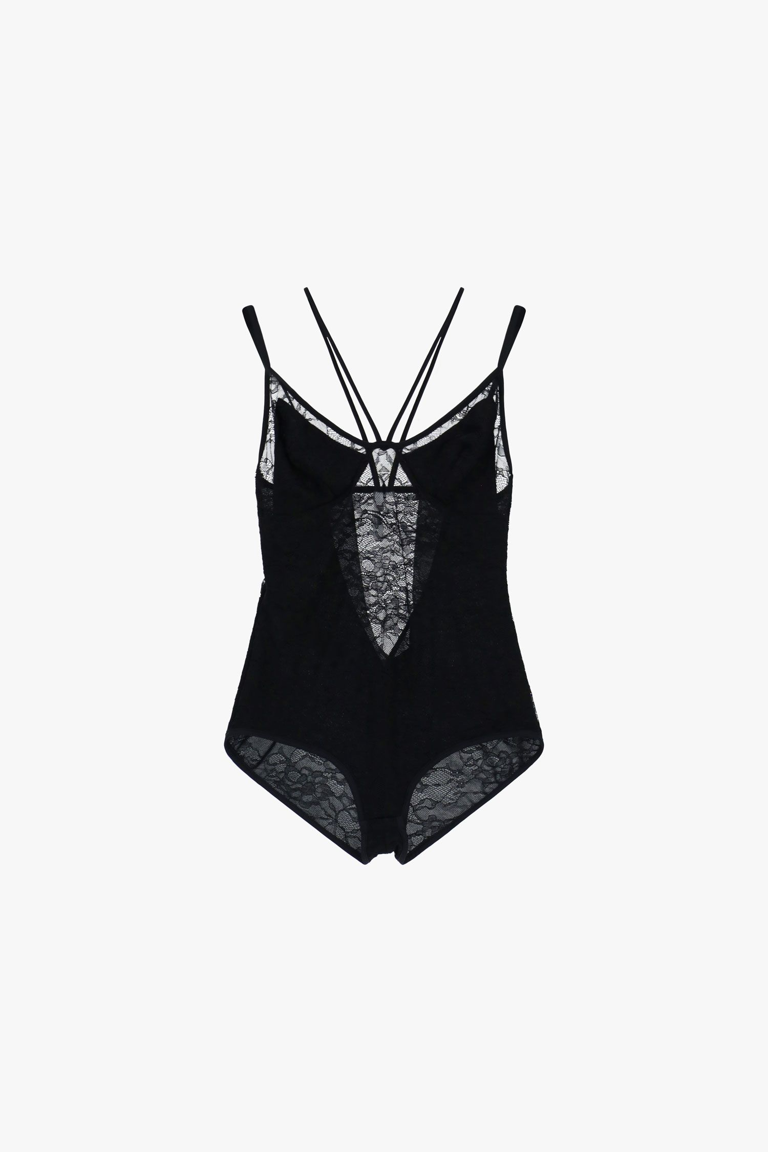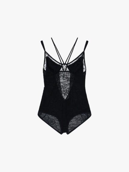 Dopasowane body z delikatnymi koronkowymi panelami i cienkimi, skrzyżowanymi ramiączkami podkreślającymi ramiona.