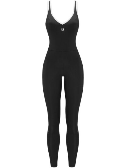 Czarny Kombinezon Le Sport Jumpsuit z białymi detalami, wykonany z elastycznego materiału, idealnie dopasowuje się do sylwetki, podkreślając jej atuty. Kombinezon posiada głęboki dekolt w kształcie litery U, subtelnie ozdobiony białą lamówką, która dodaje klasycznego kontrastu i przyciąga uwagę. Minimalistyczny design jest wzbogacony o małe, stylowe logo na przodzie, podkreślające markę z dbałością o detale. Ten wszechstronny kombinezon świetnie sprawdzi się zarówno na co dzień, jak i na wieczorne wyjścia, oferując styl i komfort w jednym.