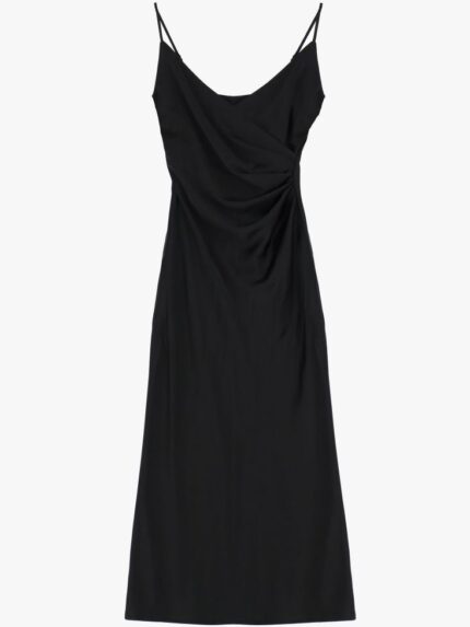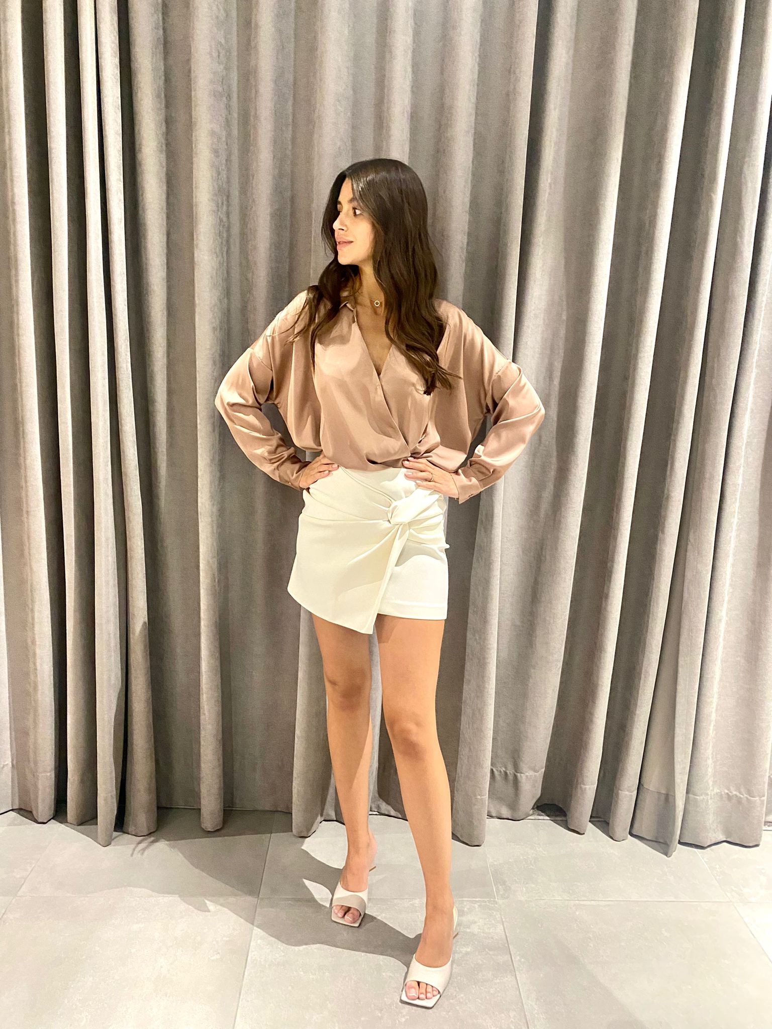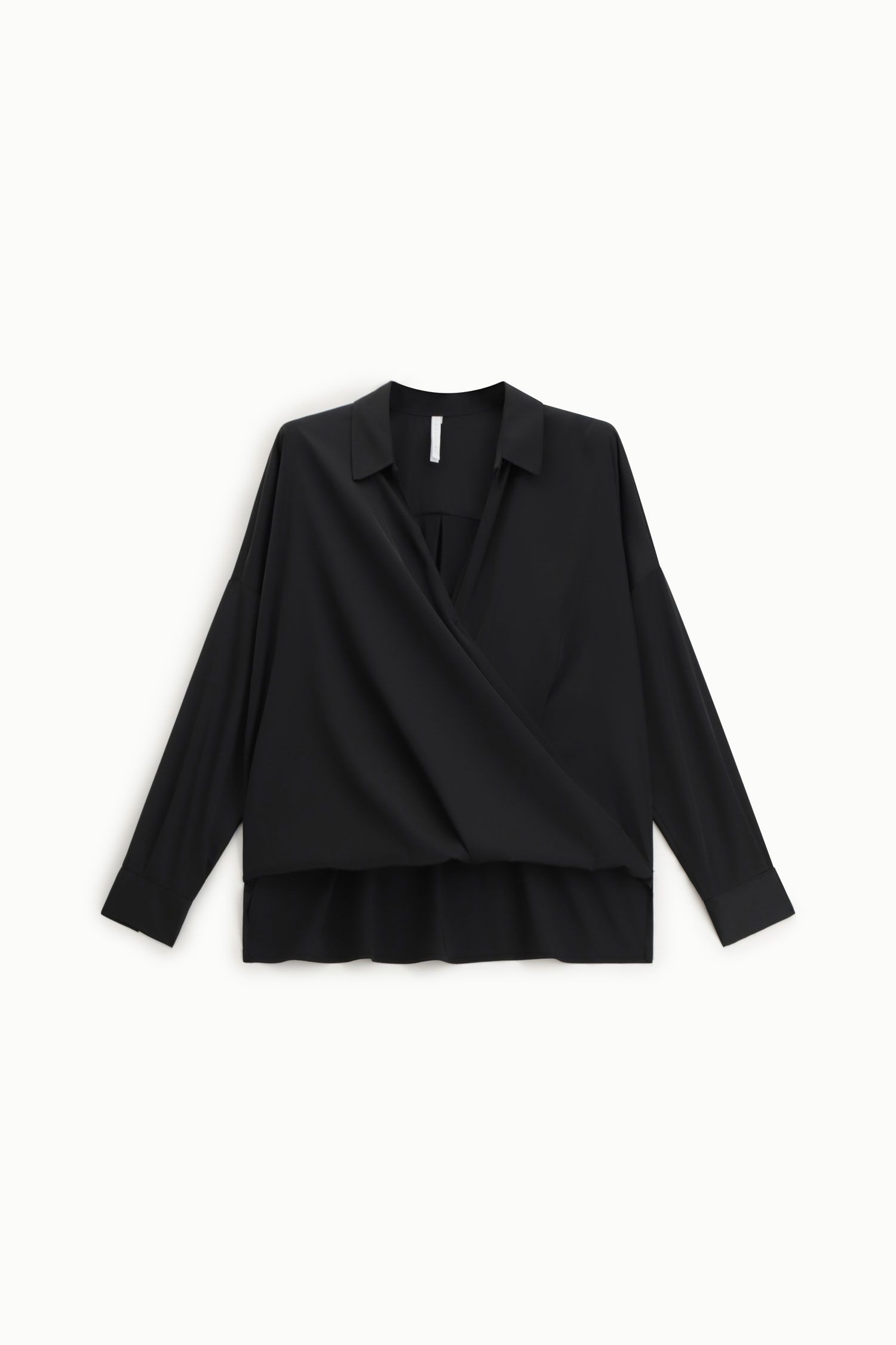 Kopertowa koszula z klasycznym kołnierzykiem, długie rękawy z obniżonymi ramionami i mankietami oraz asymetryczny, schodkowy dół.