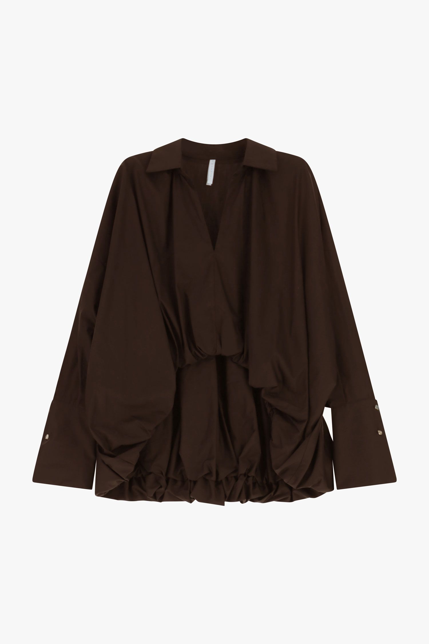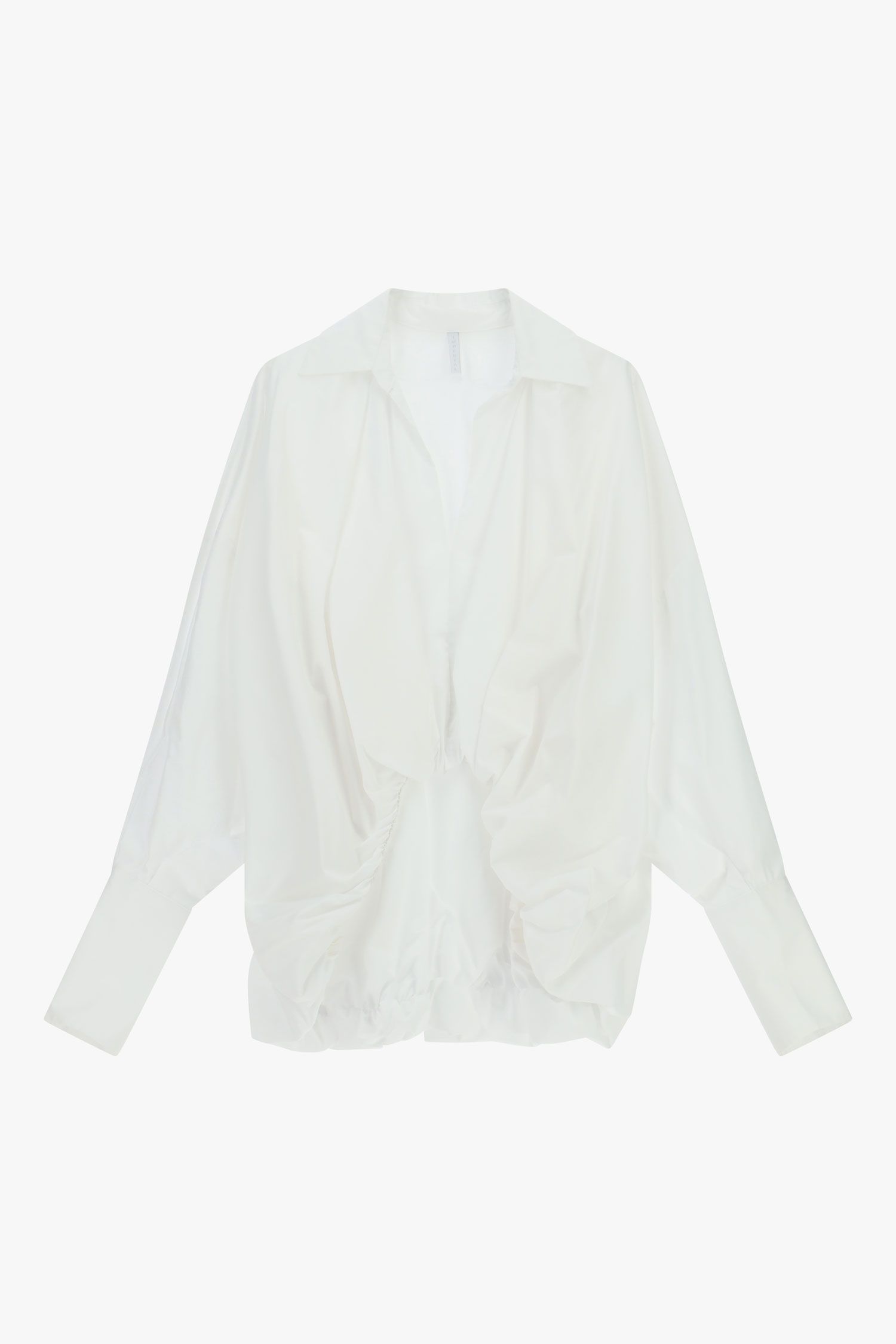 Koszula w dużym rozmiarze z klasycznym kołnierzykiem i głębokim dekoltem w serek. Długie rękawy i delikatnie marszczony dół nadają wyjątkową objętość i ruch, co czyni ten element atrakcyjnym wyborem dla osób poszukujących wszechstronnych stylizacji i możliwości wyrażenia siebie poprzez innowacyjne sylwetki.