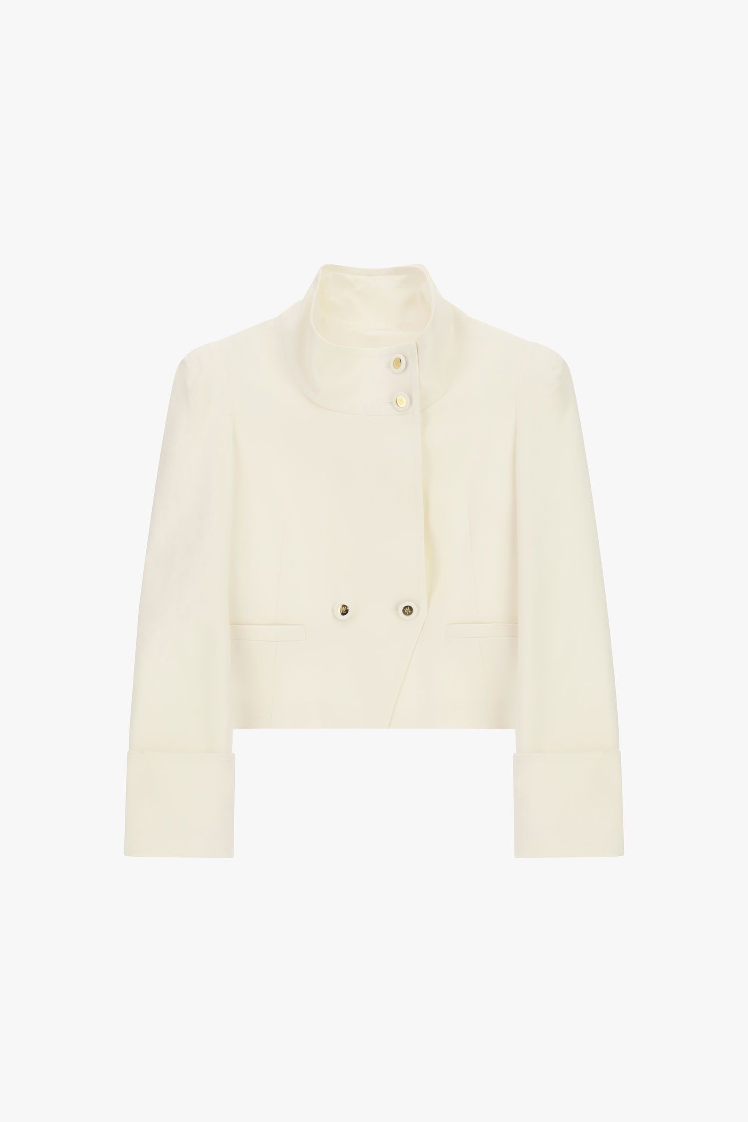 Krótka marynarka koszulowa z dwurzędowym zapięciem, wysokim kołnierzem i szerokimi mankietami.