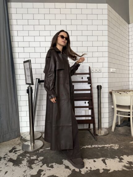 Płaszcz ze skóry naturalnej w odcieniu czekoladowego brązu.