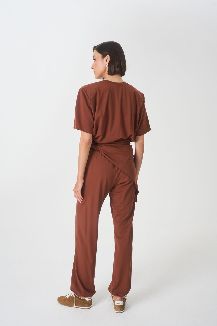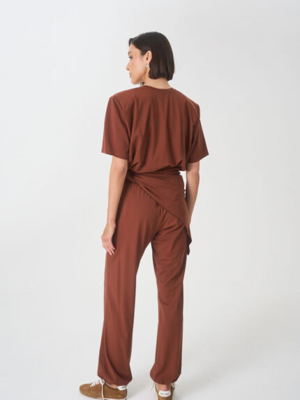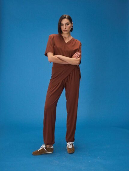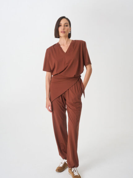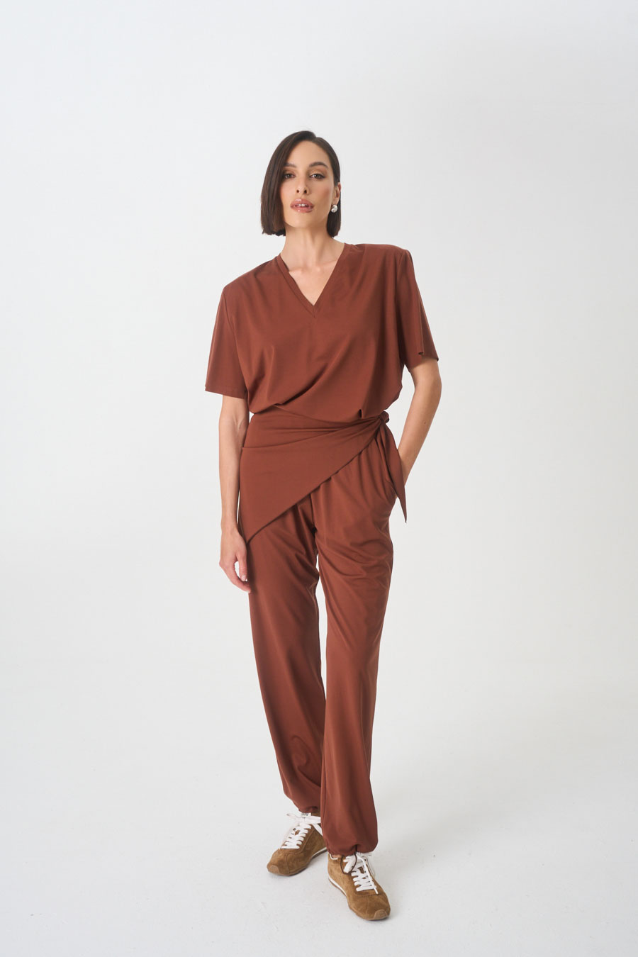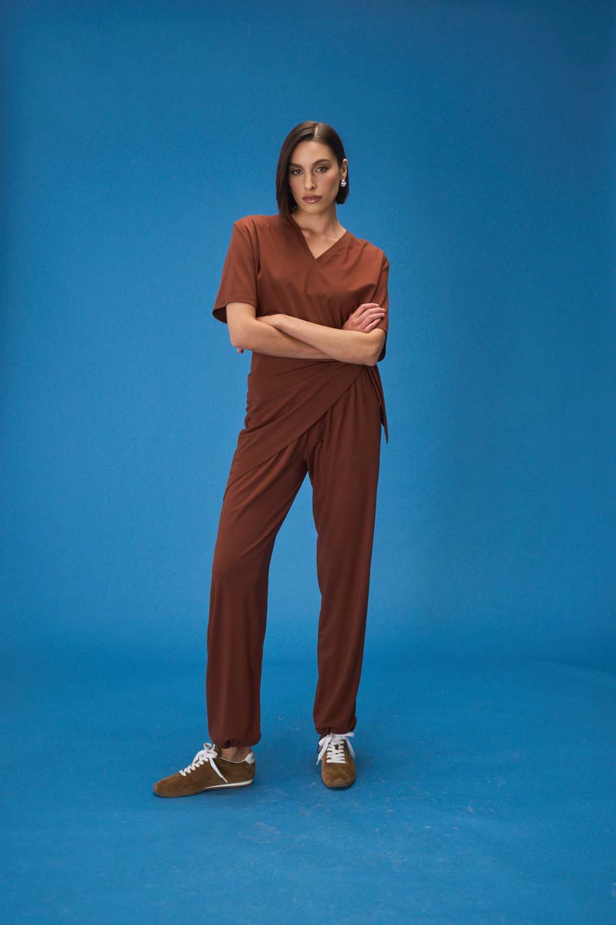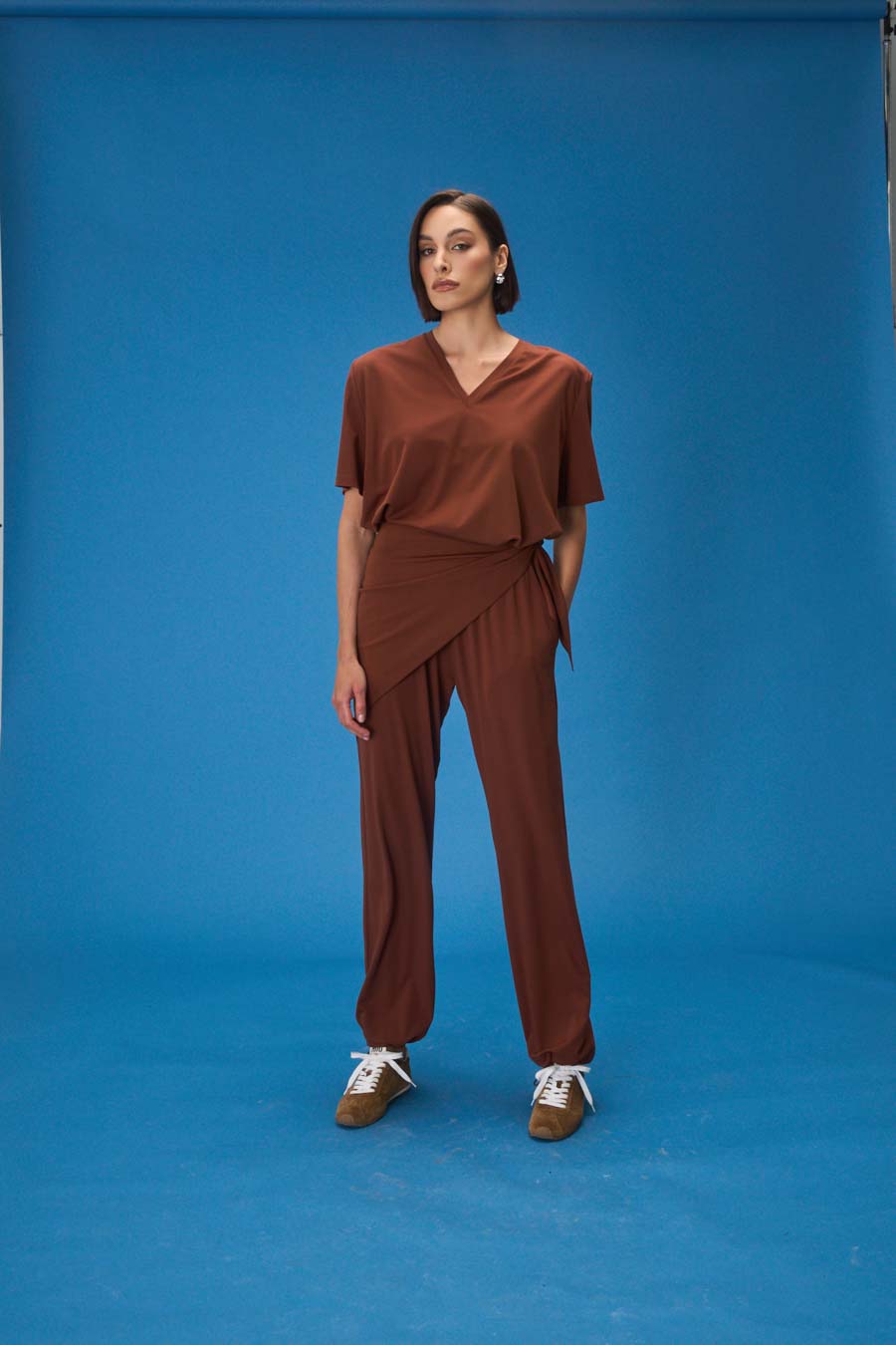 Szerokie nogawki, na dole stopery pozwalające na dowolną stylizację.