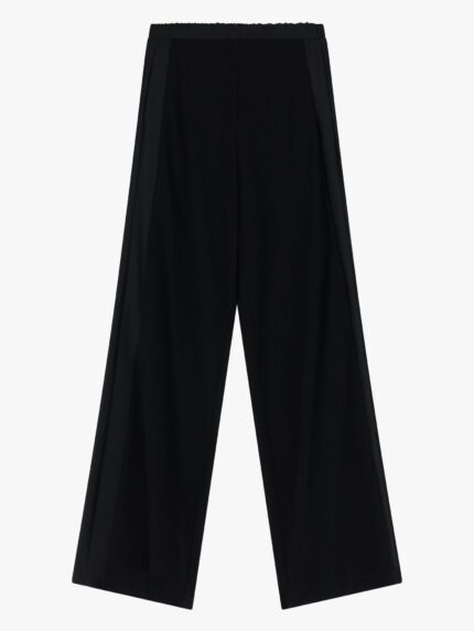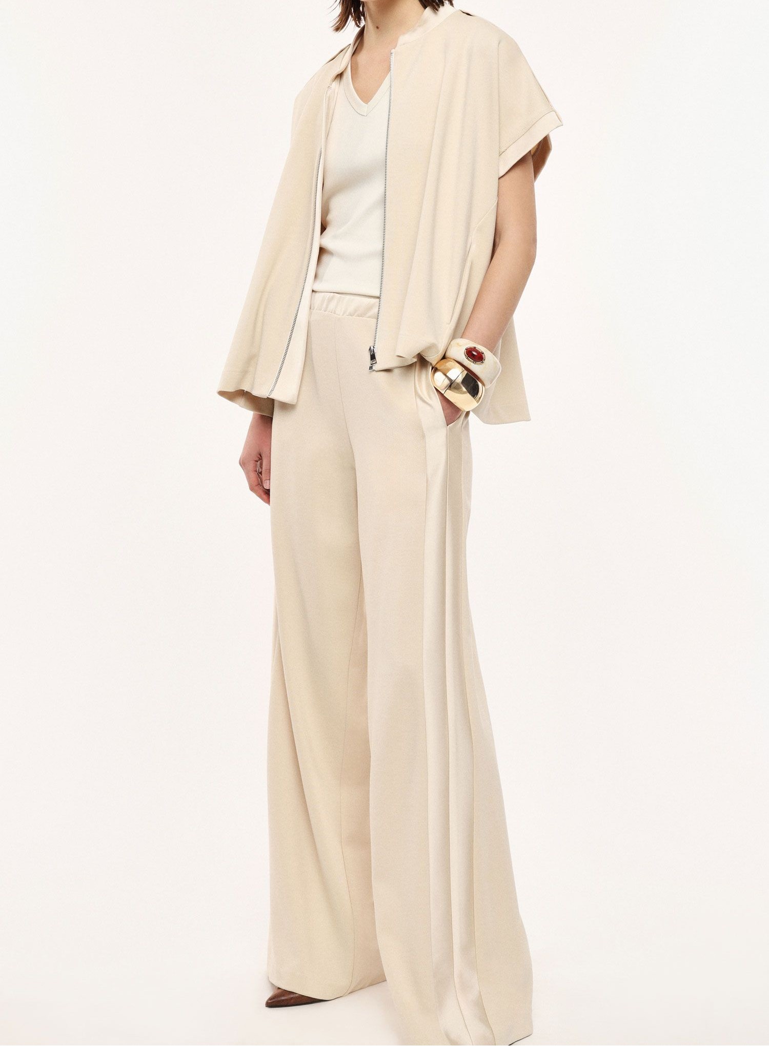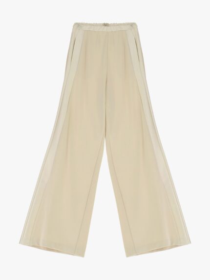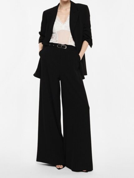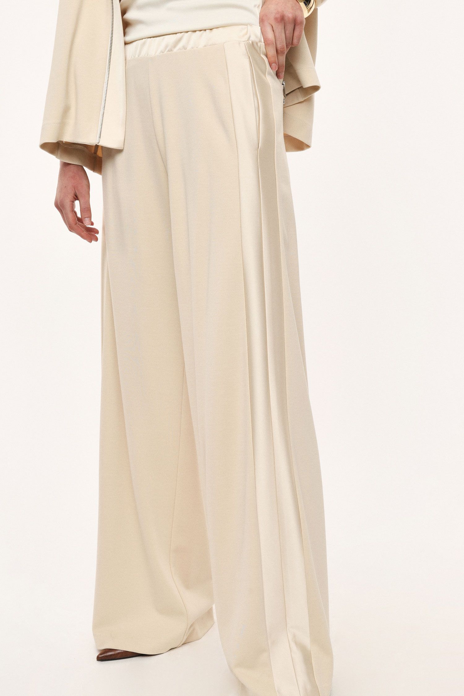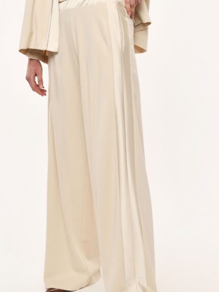 Spodnie palazzo o szerokim, luźnym kroju z wysokim, elastycznym pasem dla optymalnego komfortu. Wyraźne boczne szwy i subtelny układ materiału zapewniają wszechstronność w nowoczesnych, miejskich stylizacjach. Boczne kieszenie zwiększają praktyczność, czyniąc te spodnie idealnym wyborem do ekspresyjnych, stylowych zestawów.