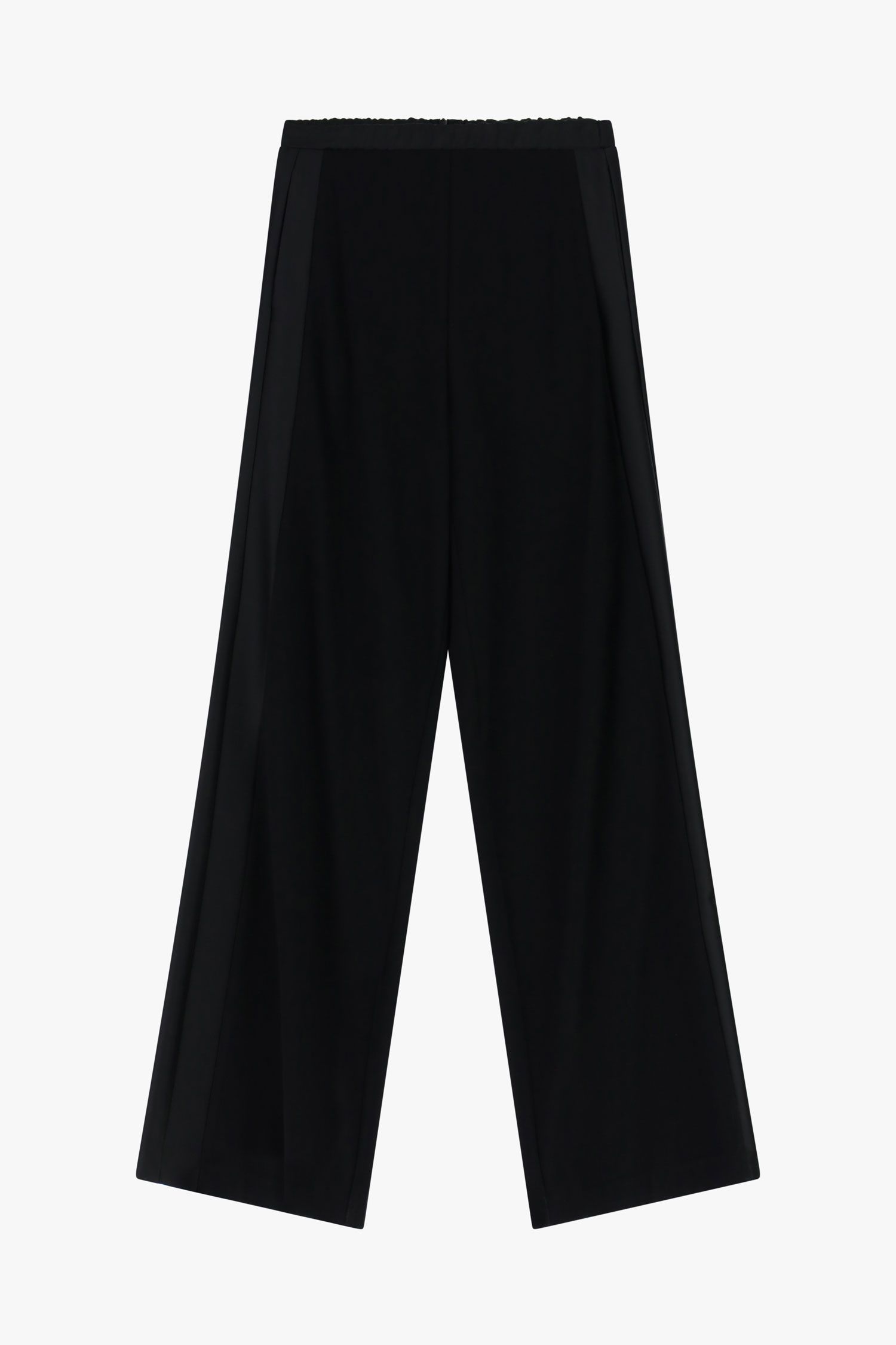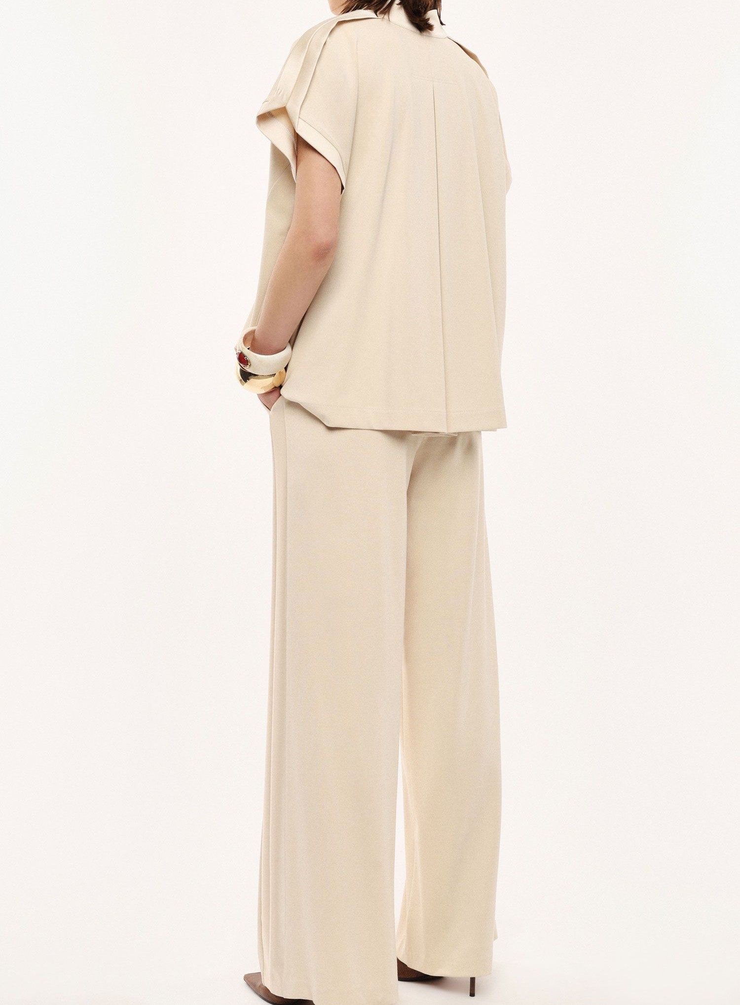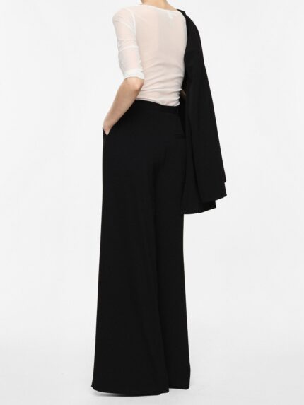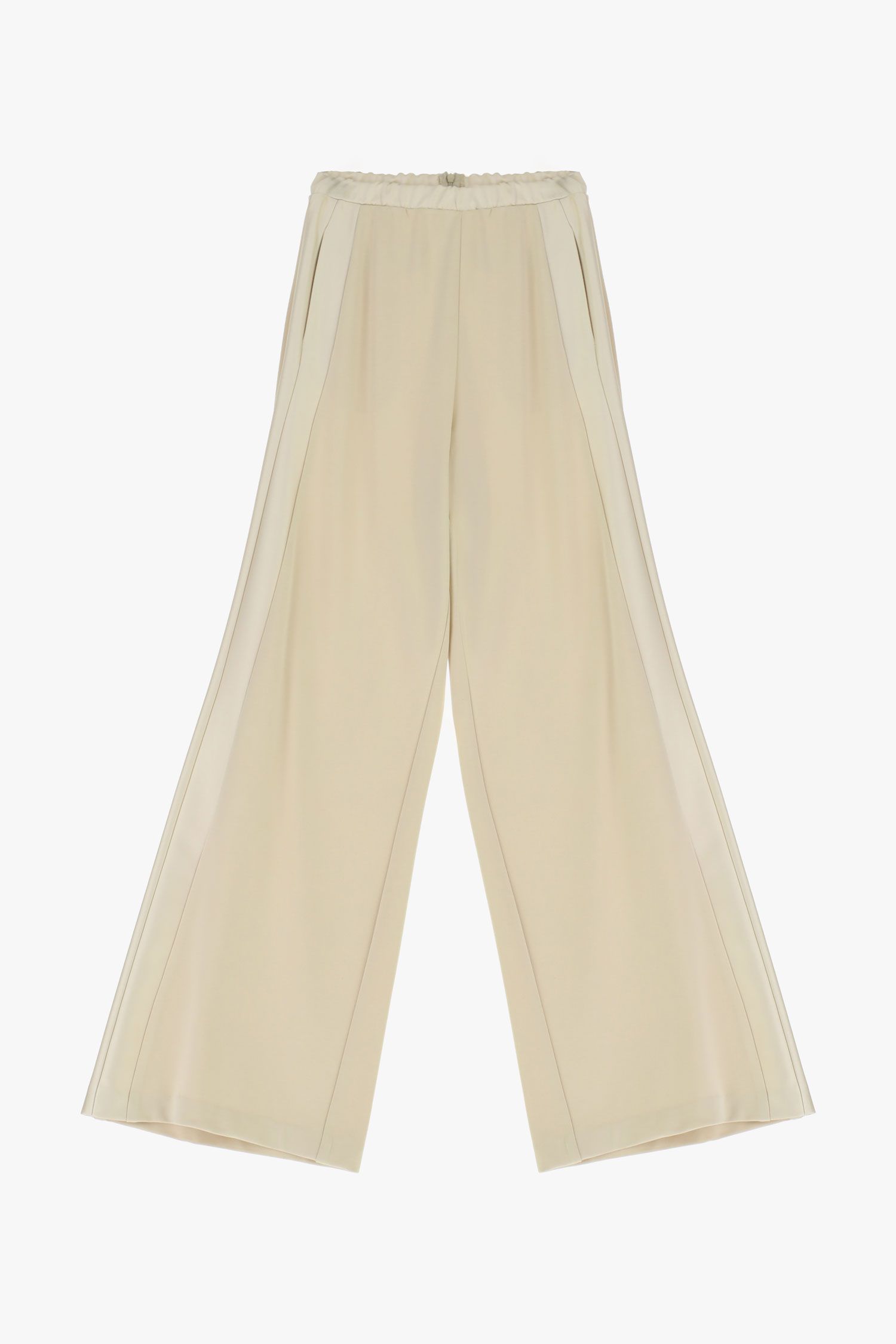 Spodnie palazzo o szerokim, luźnym kroju z wysokim, elastycznym pasem dla optymalnego komfortu. Wyraźne boczne szwy i subtelny układ materiału zapewniają wszechstronność w nowoczesnych, miejskich stylizacjach. Boczne kieszenie zwiększają praktyczność, czyniąc te spodnie idealnym wyborem do ekspresyjnych, stylowych zestawów.