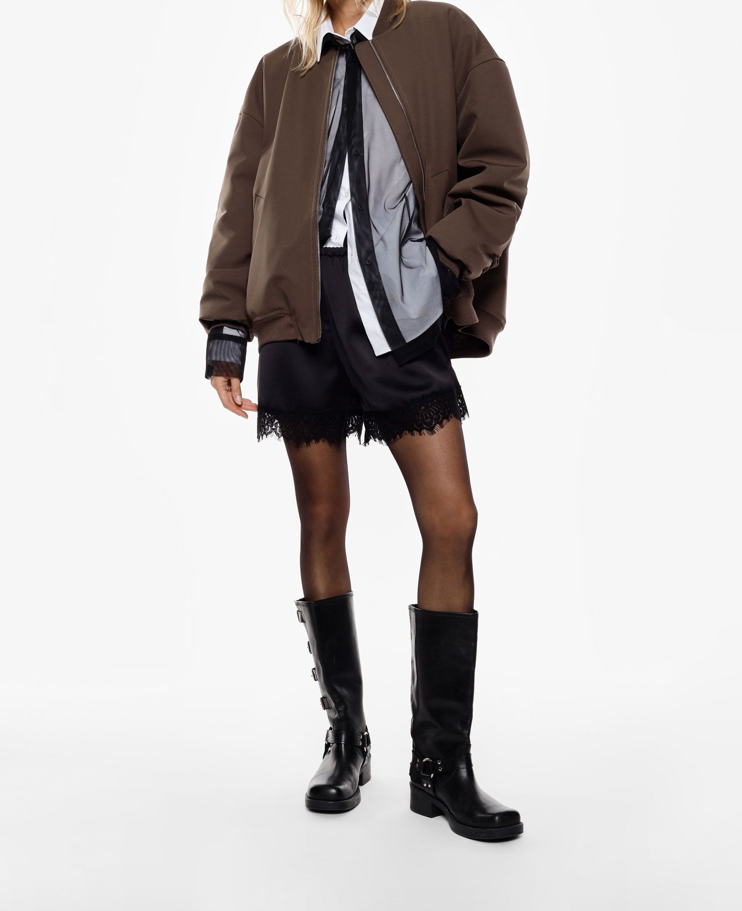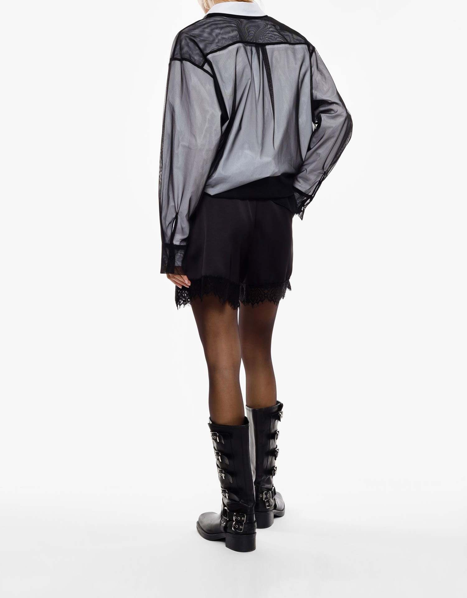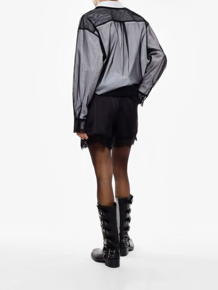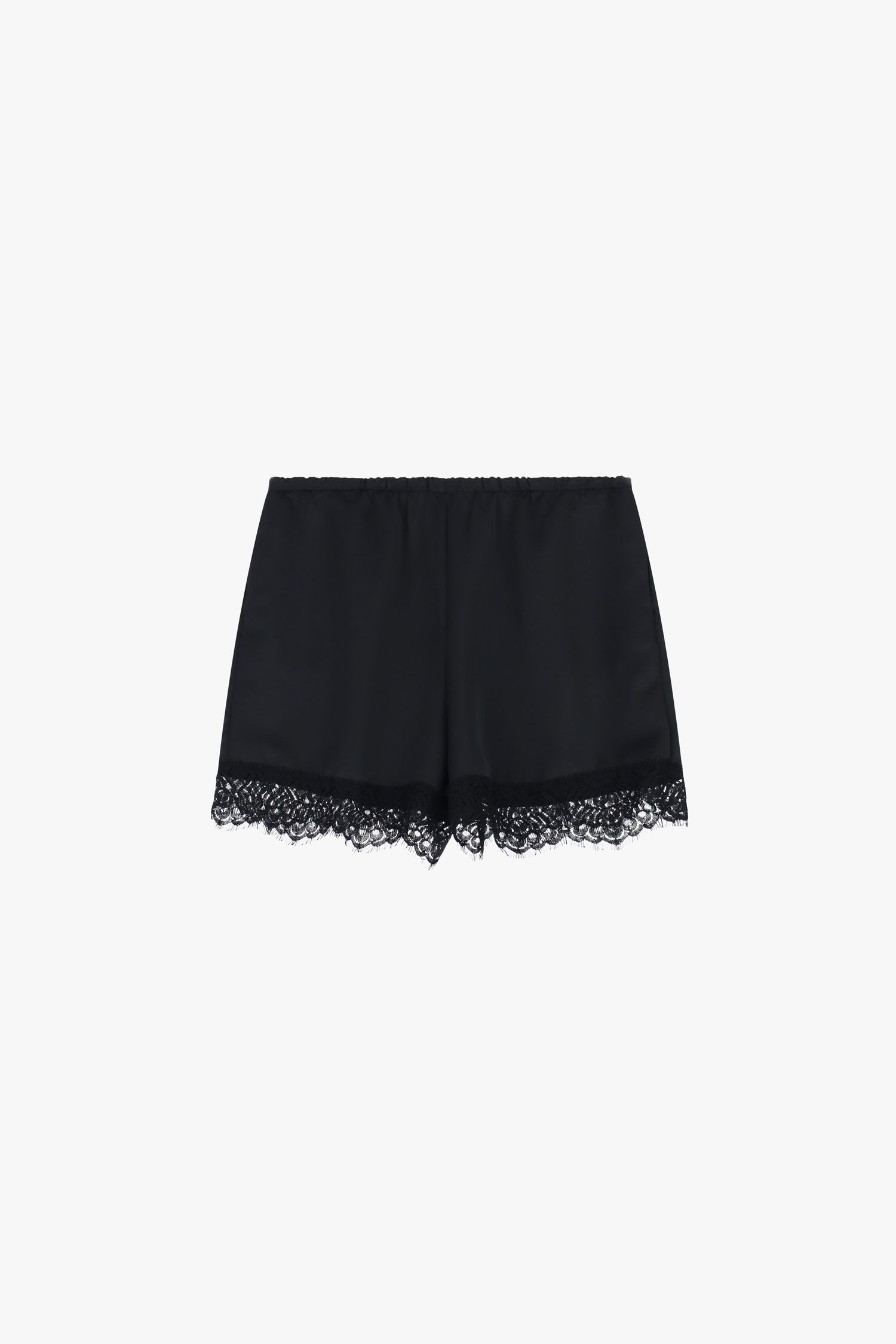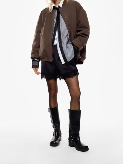 Szorty o regularnym kroju, ozdobione dekoracyjną koronką przy krawędzi, dodającą charakteru nowoczesnym stylizacjom. Elastyczna talia zapewnia wygodne dopasowanie, a minimalistyczny design umożliwia szerokie możliwości stylizacyjne dla osób poszukujących wyrazu osobistego stylu.