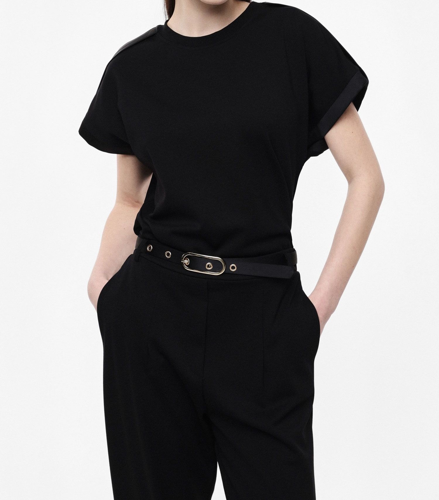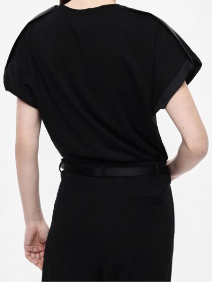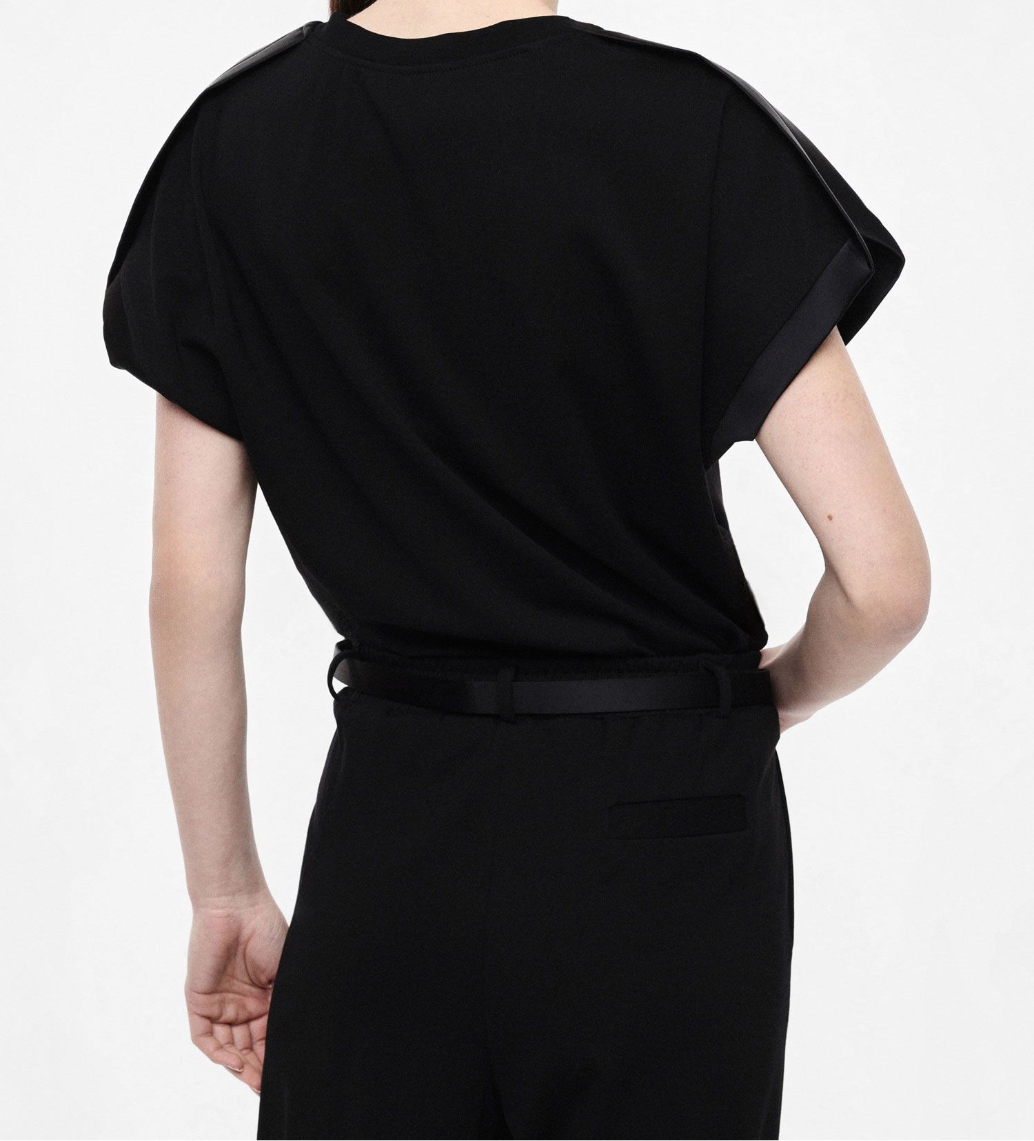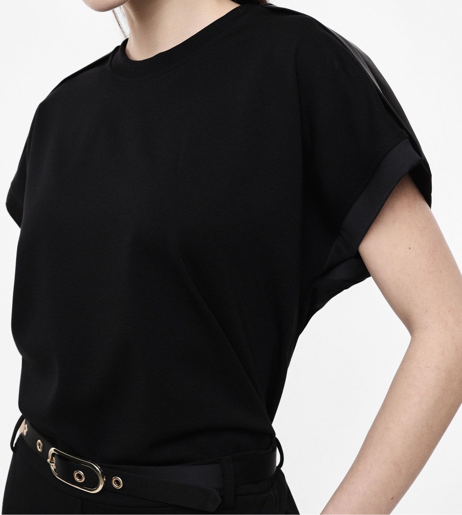 Krótki top z usztywnionymi ramionami i wyraźnym obszyciem wzdłuż ramion. Wszechstronna opcja, odpowiednia zarówno do casualowych stylizacji, jak i bardziej wyrafinowanych zestawień. Dostępny w różnych odcieniach, aby pasował do różnych osobistych stylów i ekspresji twórczych.