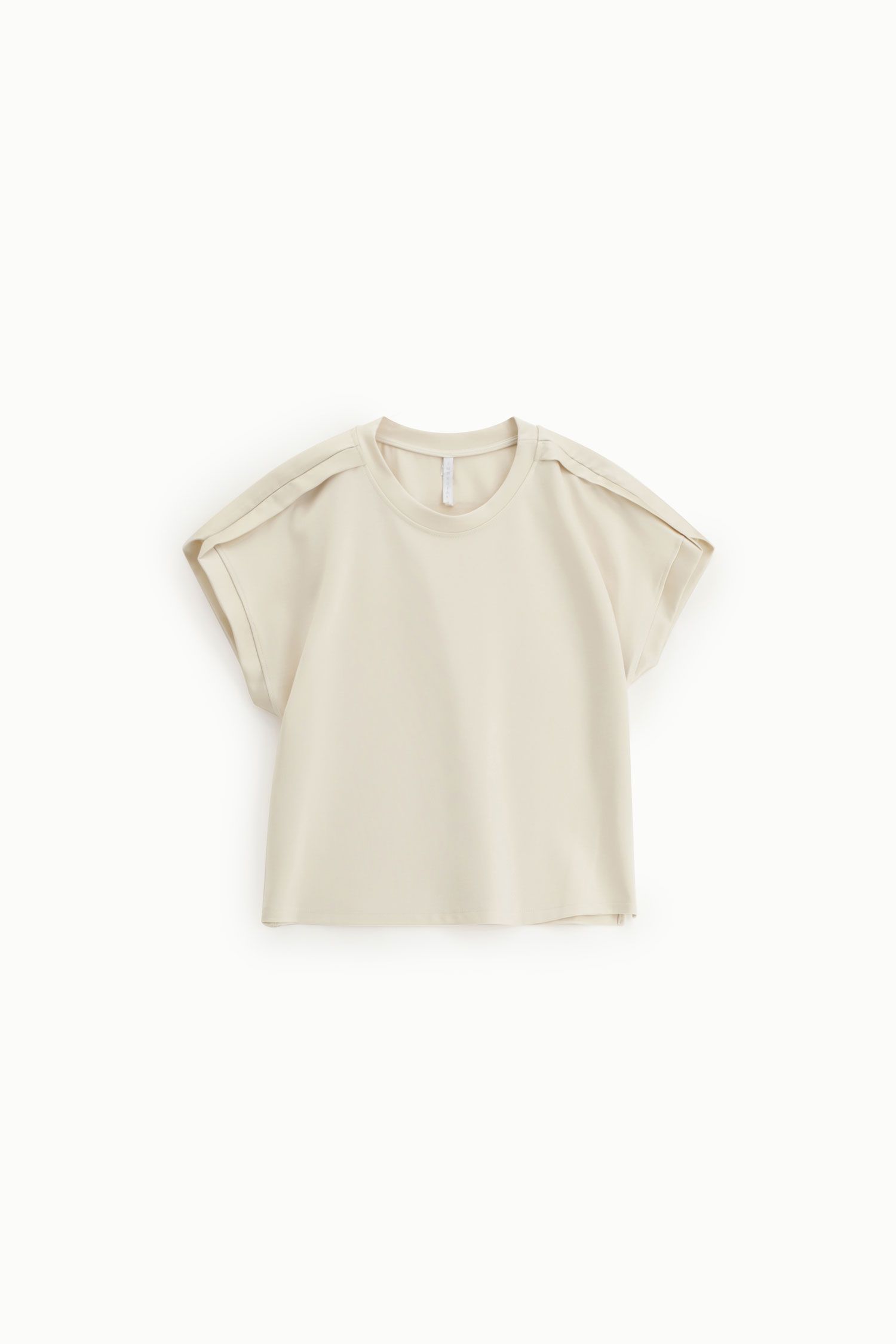 Krótki t-shirt o pudełkowym kroju, z wyraźnie zarysowanymi ramionami i charakterystyczną lamówką wzdłuż ramion. Uniwersalny wybór, odpowiedni zarówno do casualowych stylizacji, jak i bardziej wyrafinowanych zestawów.