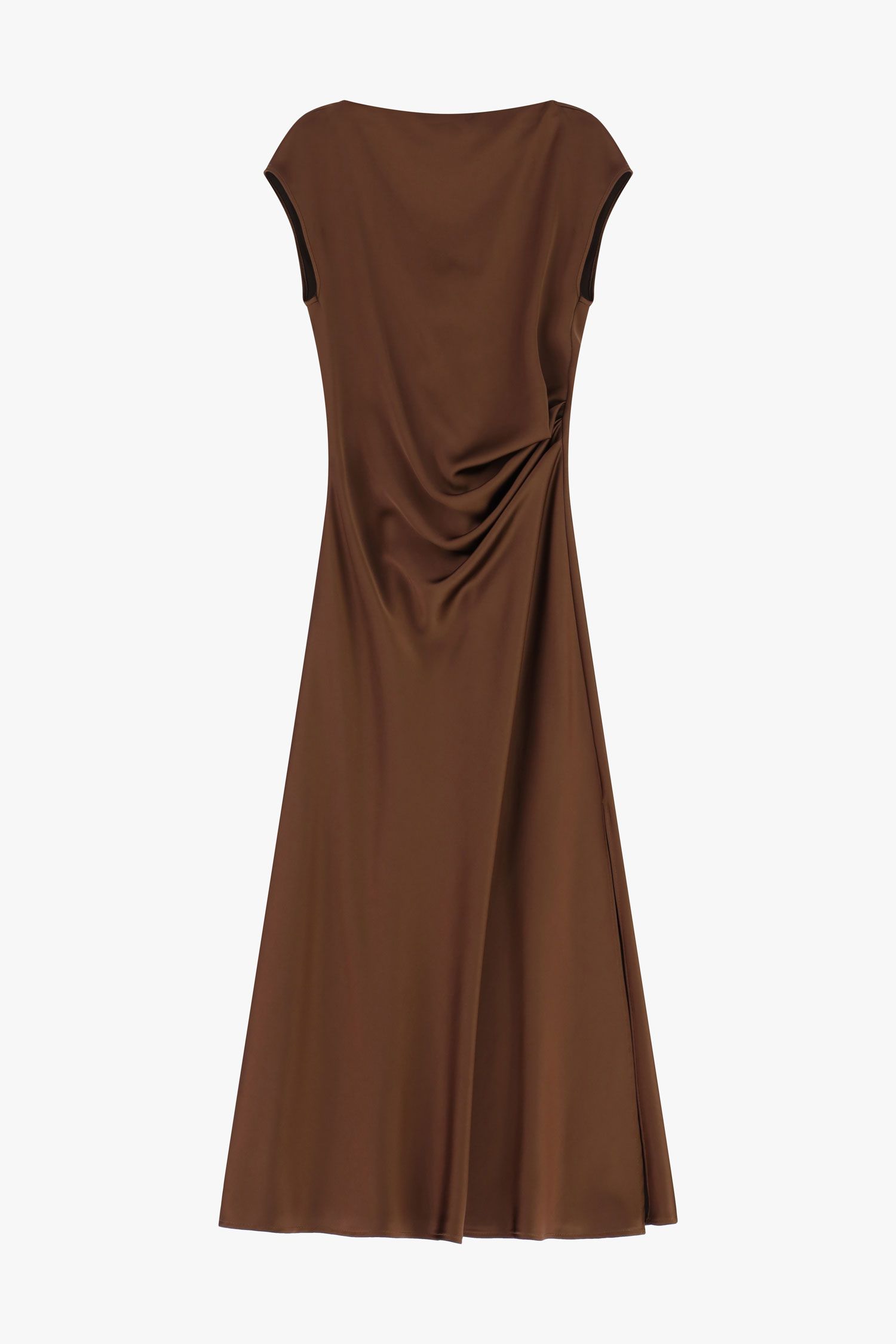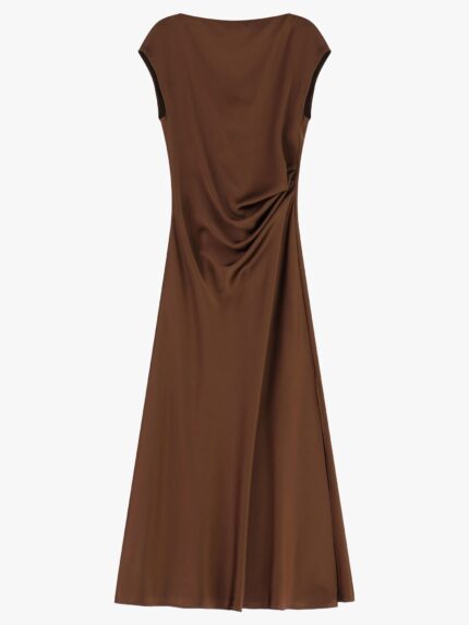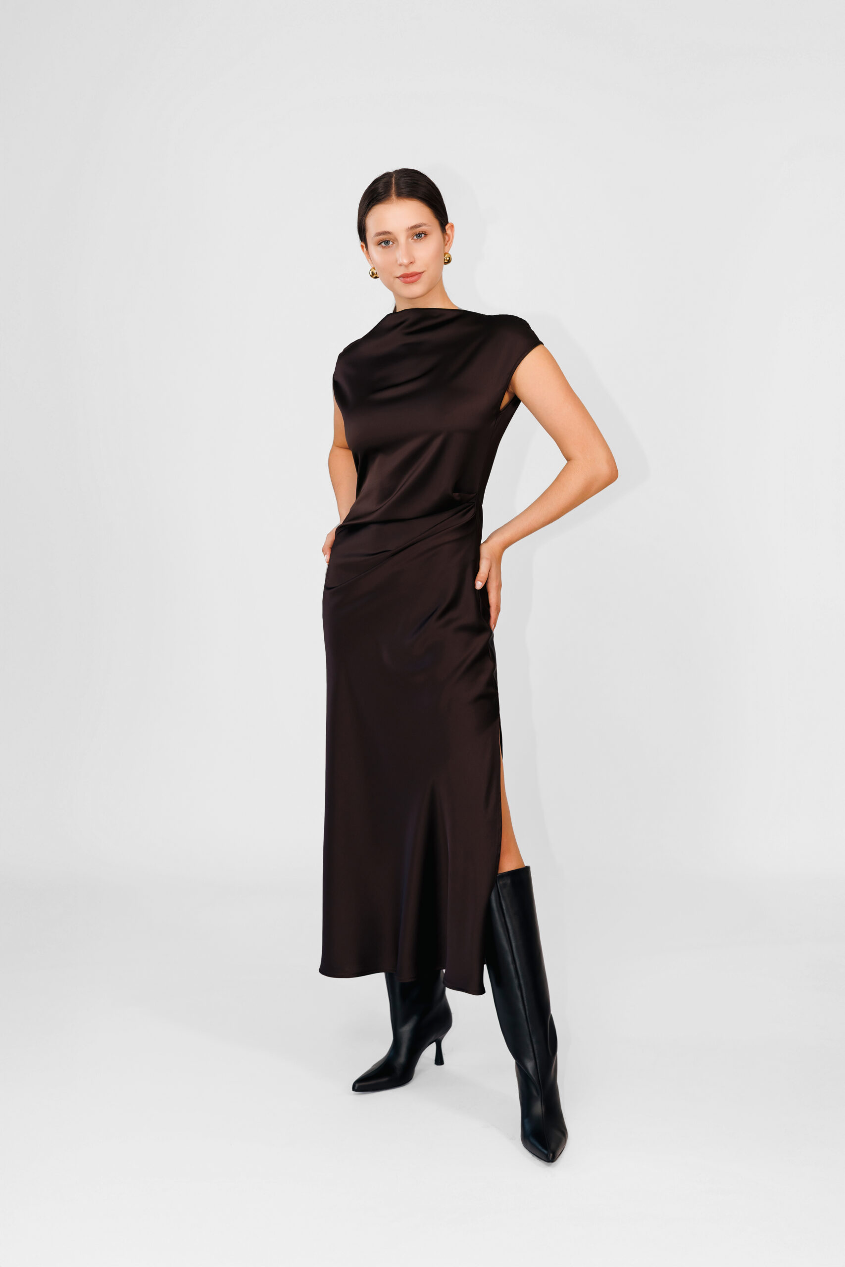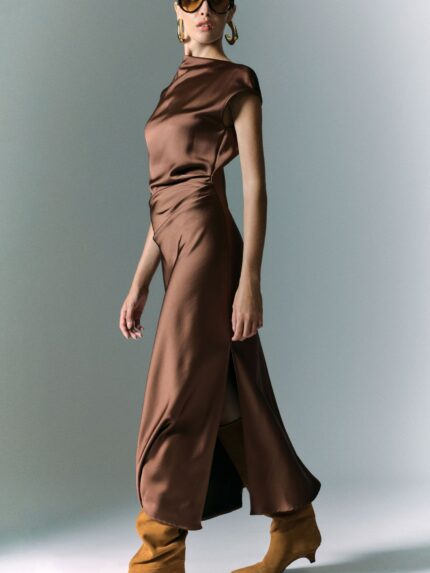 Długa sukienka o płynnej sylwetce, podkreślona asymetrycznym bocznym drapowaniem, które dodaje ruchu i wymiaru. Dekolt w łódkę elegancko ramionuje, natomiast bezrękawowy krój i głęboki boczny rozporek oferują wiele możliwości stylizacji, pozwalając na wyrafinowane i oryginalne kombinacje.