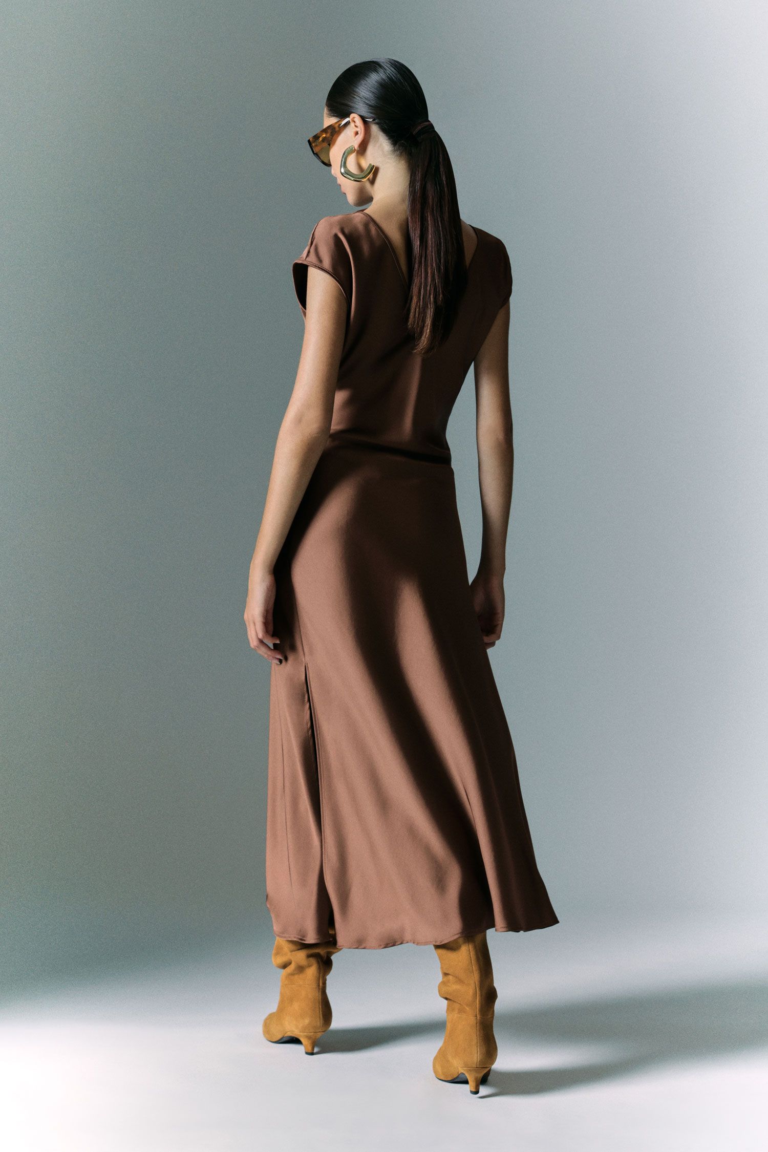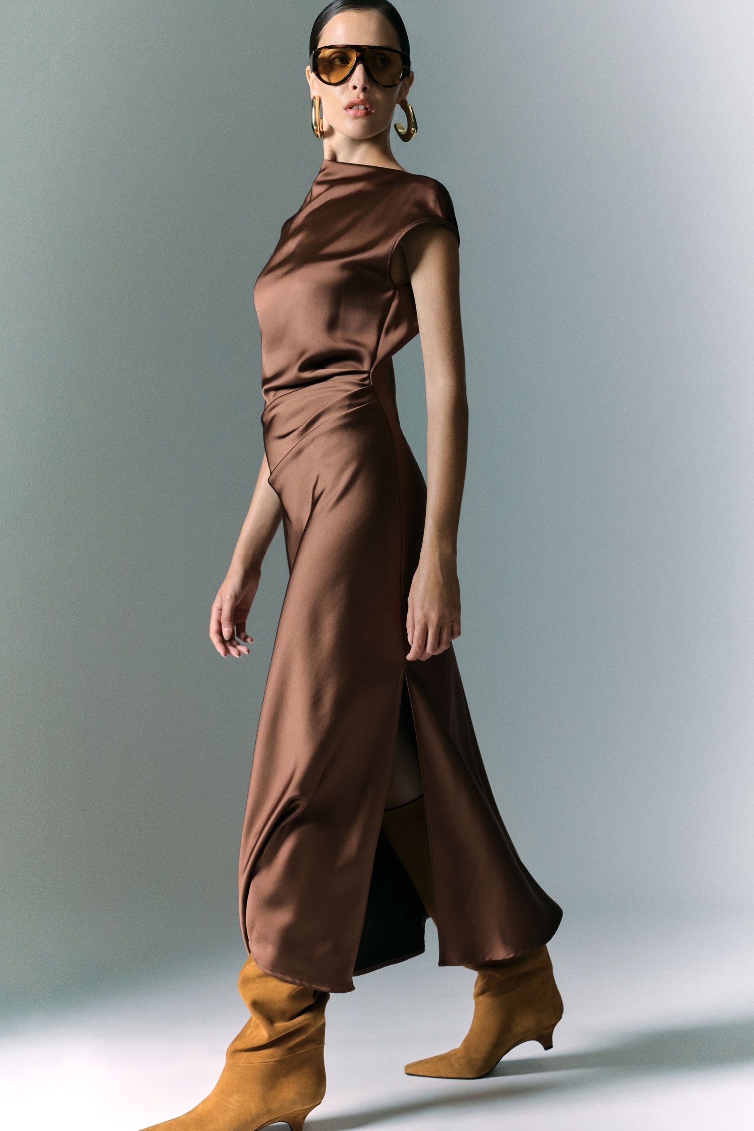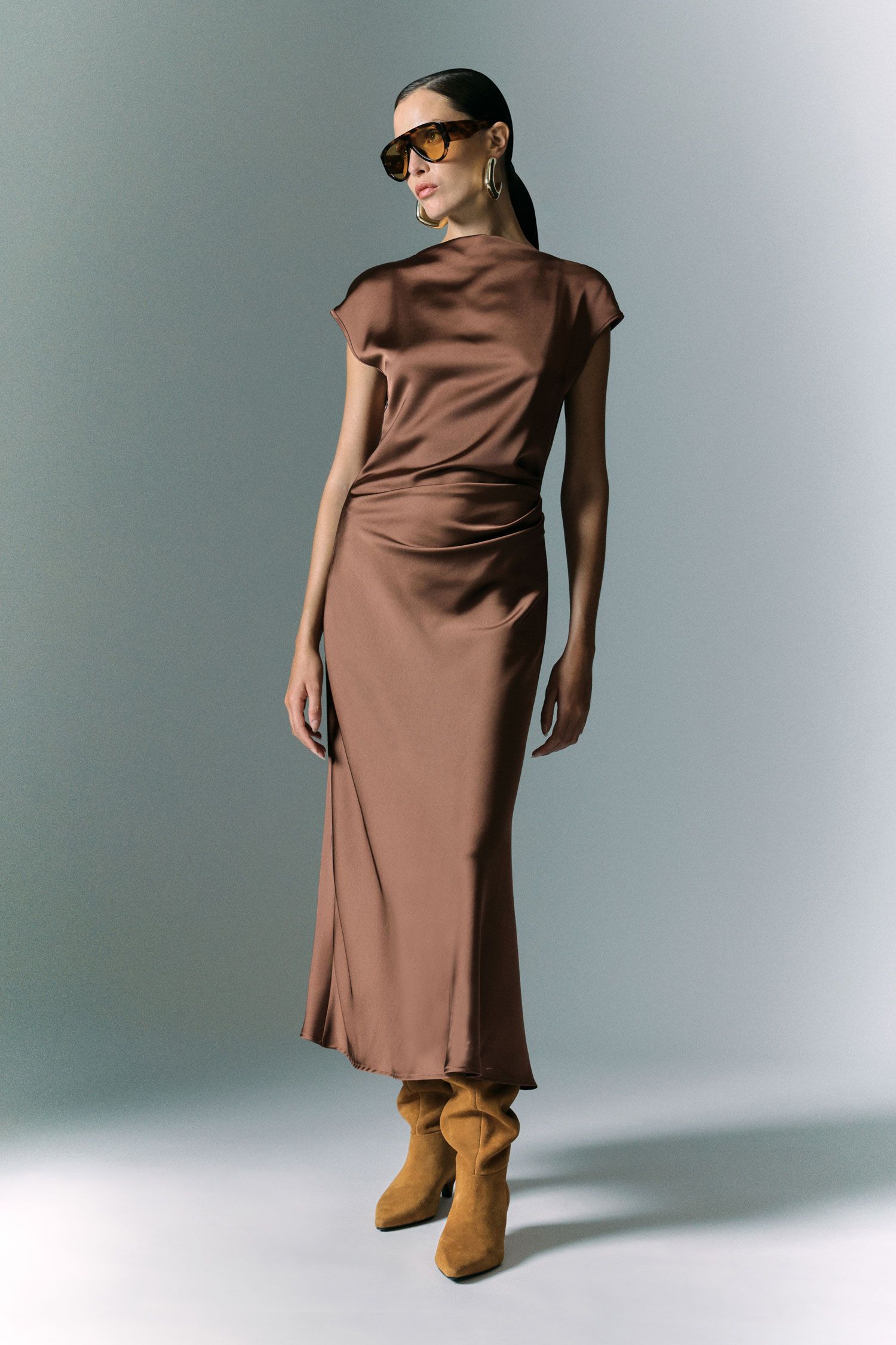 Długa sukienka o płynnej sylwetce, podkreślona asymetrycznym bocznym drapowaniem, które dodaje ruchu i wymiaru. Dekolt w łódkę elegancko ramionuje, natomiast bezrękawowy krój i głęboki boczny rozporek oferują wiele możliwości stylizacji, pozwalając na wyrafinowane i oryginalne kombinacje.