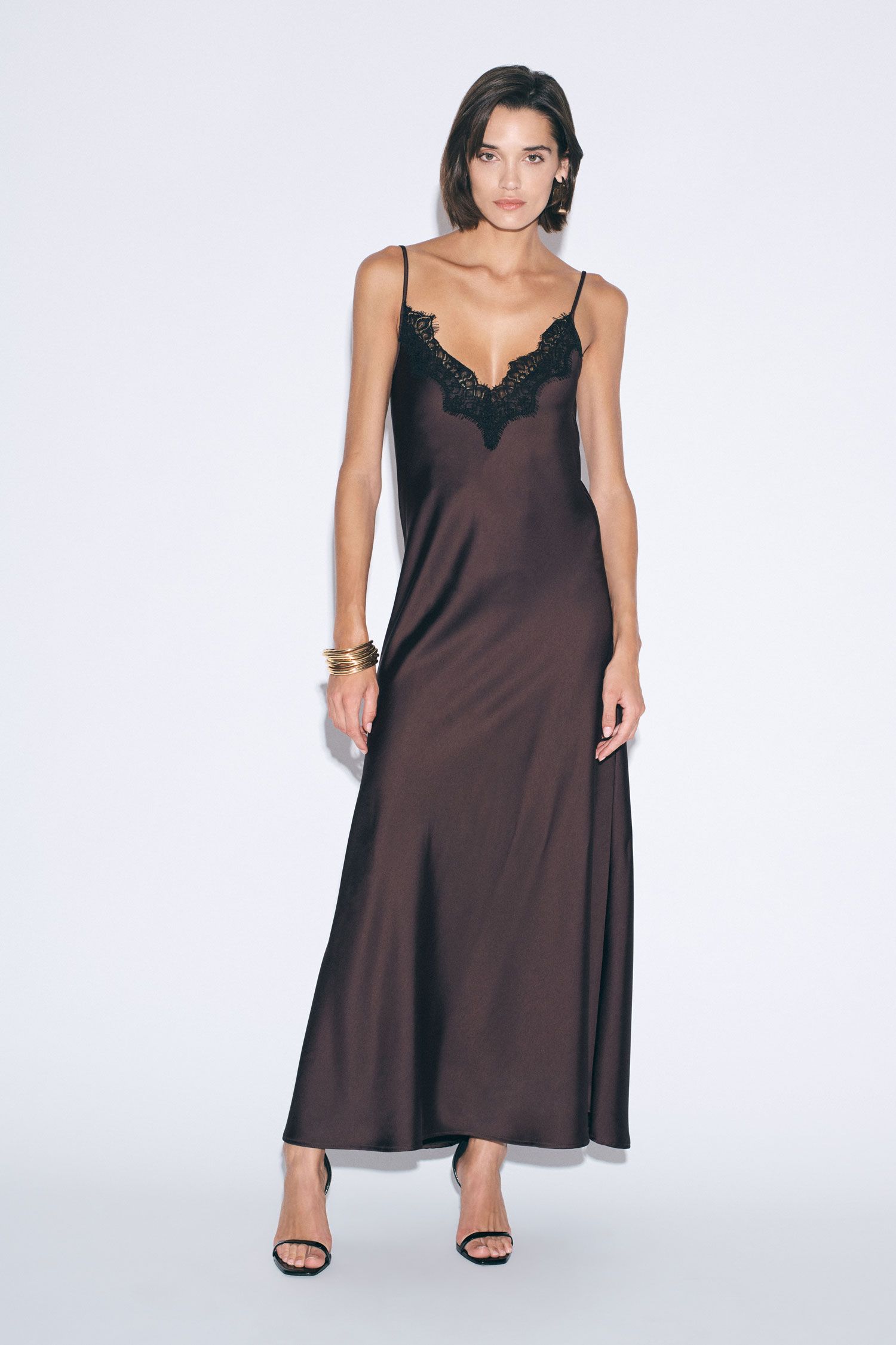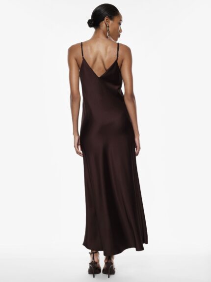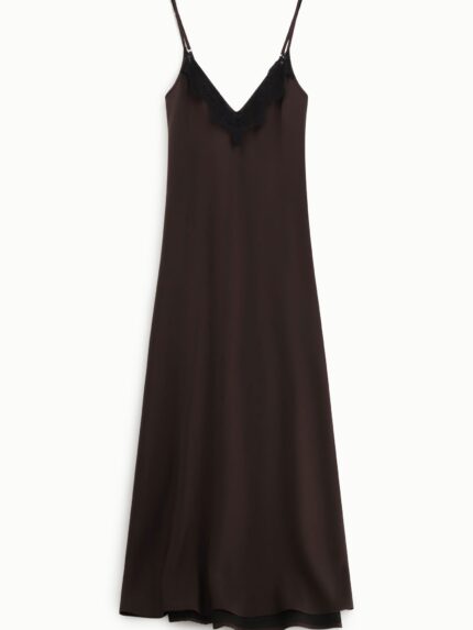 Sukienka włoskiej marki Imperial. Smukła sylwetka podkreślona delikatnymi ramiączkami i głębokim dekoltem w kształcie litery V, zdobionym koronkową lamówką. Płynny krój podąża za każdym ruchem, co czyni ją idealną do tworzenia wyrafinowanych, nowoczesnych stylizacji. Doskonała dla osób poszukujących charakterystycznego wyglądu z subtelnymi liniami i wszechstronnością do eleganckich połączeń.