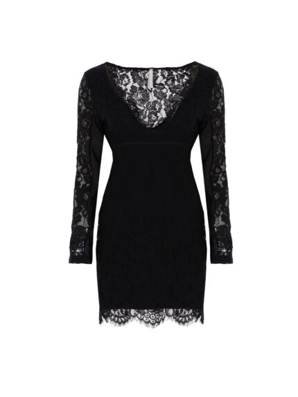 Koronkowa sukienka mini, dekolt w szpic, długie rękawy, prześwitujące plecy i ząbkowany dół.
