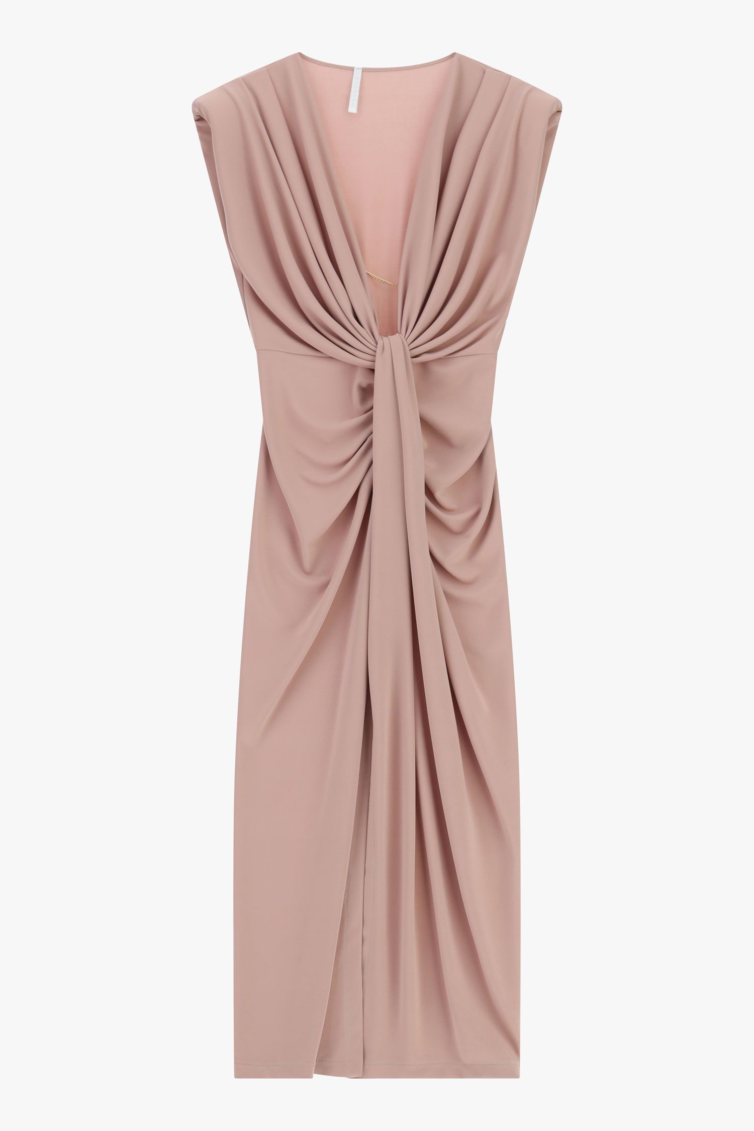 Długa sukienka bez rękawów z głębokim dekoltem w kształcie litery V i podkreślonymi ramionami, z centralnym pionowym drapowaniem tworzącym elegancki efekt marszczenia. Przesunięcie z przodu dodaje dynamicznego akcentu, co czyni ten model idealnym na wyrafinowane wieczorne wydarzenia lub kosmopolityczne okazje.