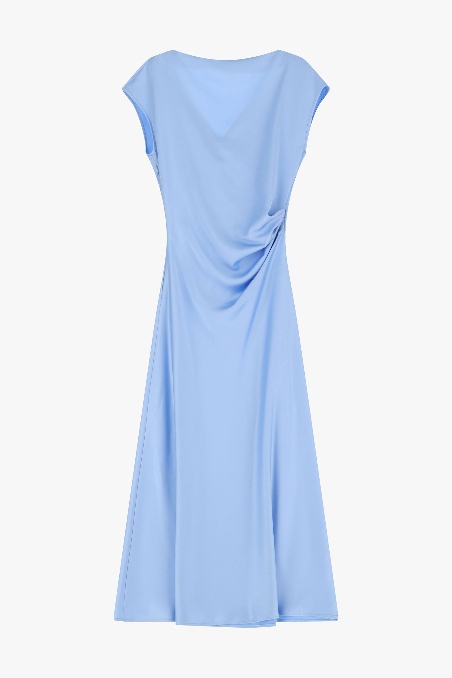 Długa sukienka o płynnej sylwetce, podkreślona asymetrycznym bocznym drapowaniem, które dodaje ruchu i wymiaru. Dekolt w łódkę elegancko ramionuje, natomiast bezrękawowy krój i głęboki boczny rozporek oferują wiele możliwości stylizacji, pozwalając na wyrafinowane i oryginalne kombinacje.