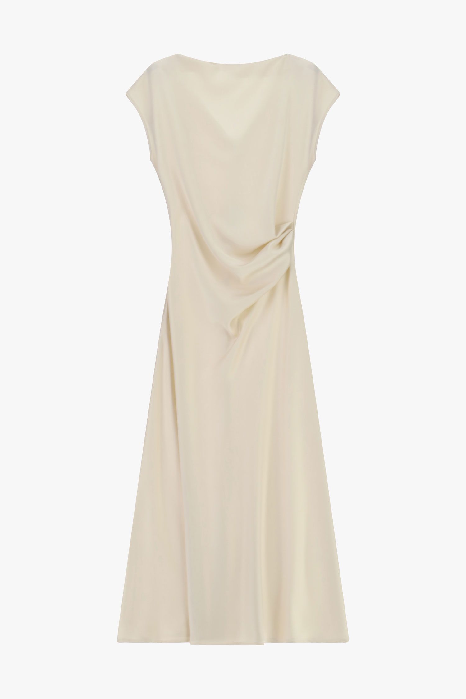 Długa sukienka o płynnej sylwetce, podkreślona asymetrycznym bocznym drapowaniem, które dodaje ruchu i wymiaru. Dekolt w łódkę elegancko ramionuje, natomiast bezrękawowy krój i głęboki boczny rozporek oferują wiele możliwości stylizacji, pozwalając na wyrafinowane i oryginalne kombinacje.