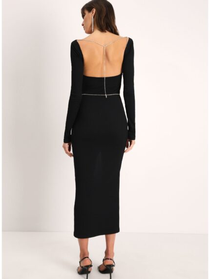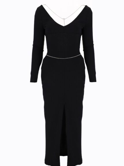 Sukienka midi, szeroki dekolt w szpic, długie rękawy, łańcuszki na szyi i talii oraz rozcięcie z przodu.